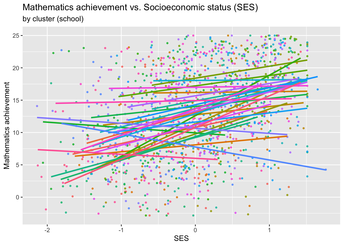 This plot shows a general trend for the whole data set, but we also would want to plot the trend for each school. To do this, we convert the school IDs into a factor with 30 levels and plot each school using a different colour.
