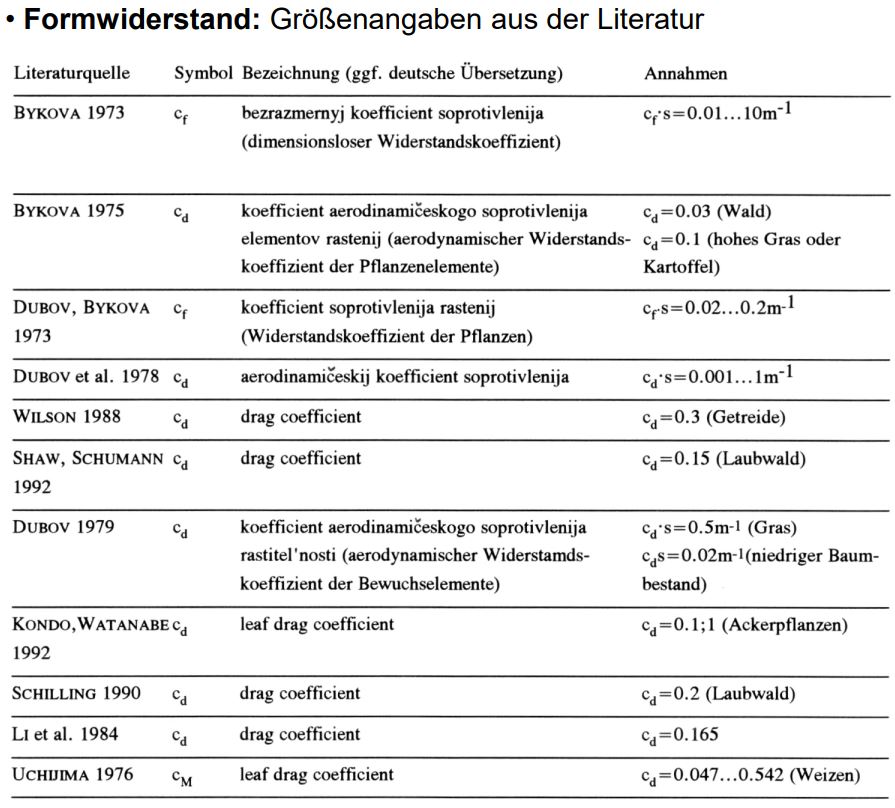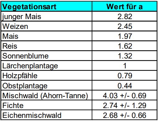 \(a\): Extinktionskoeffizient, \(v_h(z)\): Windgeschwindigkeit in der Höhe z, \(v_H\): Windgeschwindigkeit in Bestandeshöhe.