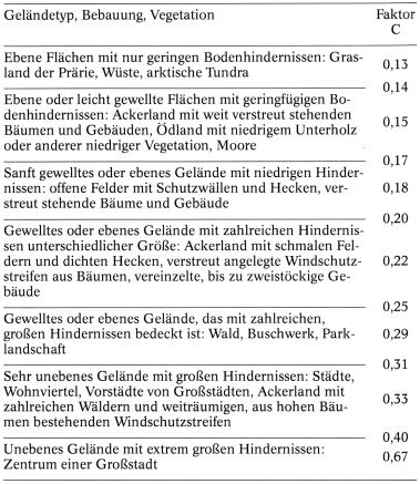 Rauigkeitsparameter (Exponent) im Potenzwindgesetz (aus Häckel, Meteorologie, 1993)
