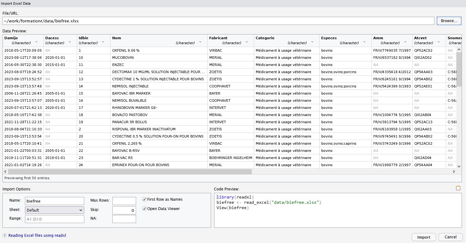 - Une fois le fichier sélectionné, RStudio vous affiche un aperçu des données et génère automatiquement le code R correspondant pour l’importation.