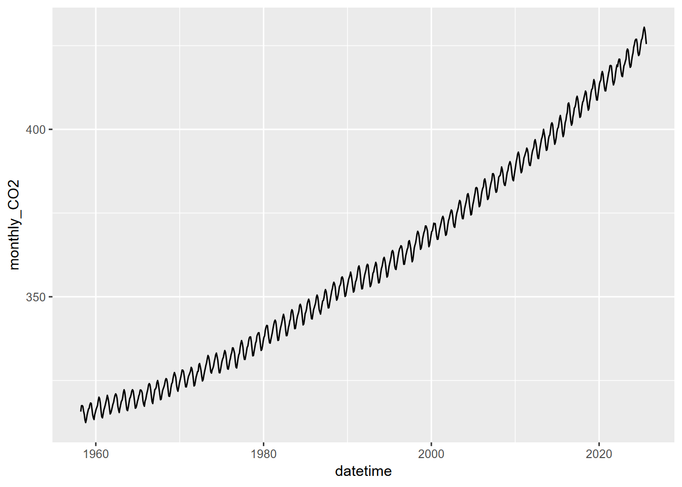 We’ll use R code to download and prepare the data for plotting. The source file at NOAA https://gml.noaa.gov/webdata/ccgg/trends/co2/co2_mm_mlo.txt can be read directly into a data frame. We’ll start by using code to download the text file into the current working directory: