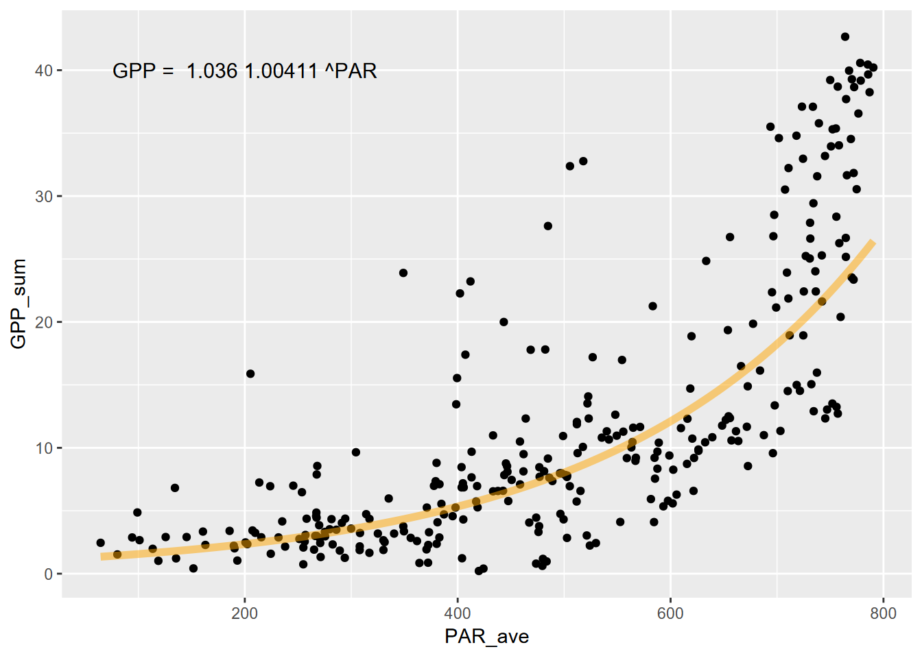 fit_eq = paste("GPP = ", round(coeff,4), round(slope,5), "^PAR")