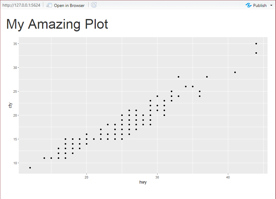 Let’s focus on the relation between the hwy (highway miles per gallon) and the cty (city miles per gallon). We want to create a shiny app that displays a scatter plot between hwy and cty. We specify our wish in the ui with plotOutput(), give it a unique id, then make it concrete within the server with renderPlot():