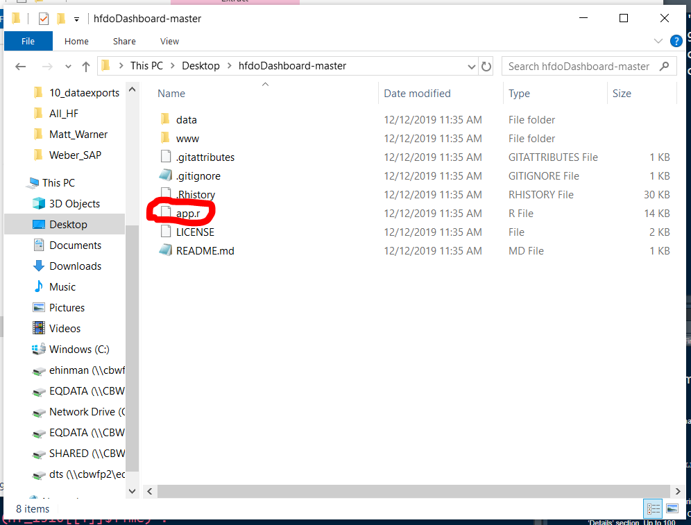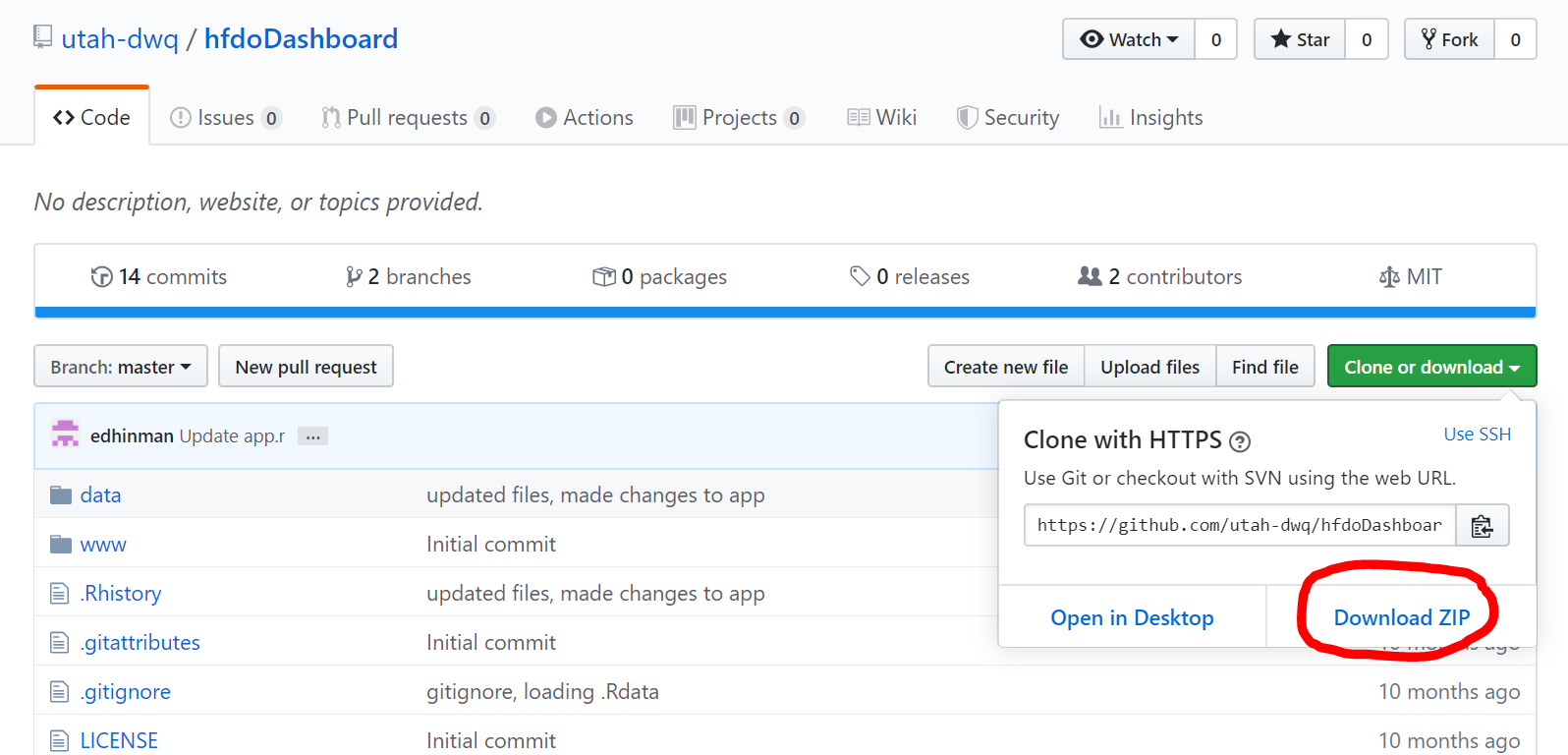 Unlike the site review and assessment review apps, the high frequency dissolved oxygen review app is not within irTools. Instead, it has its own hfdoDashboard repository at DWQ’s GitHub. Head to the repository page and download the application to a zip file.