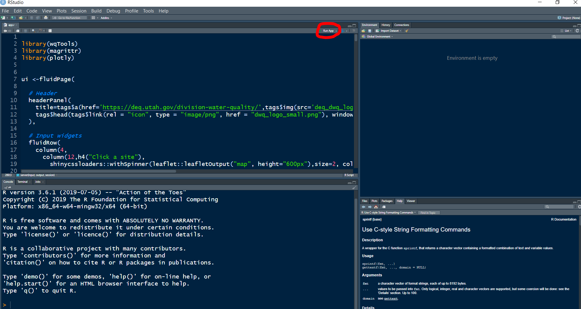 Open the app.R file using RStudio. This will bring up a long script in the upper left hand pane of the RStudio program. Next, navigate to the “Run App” button on the upper right side of the script pane. Click the small white down arrow to the right of the “Run App” text and make sure the setting is to “Run External”. This will cause the app to open in an internet browser.