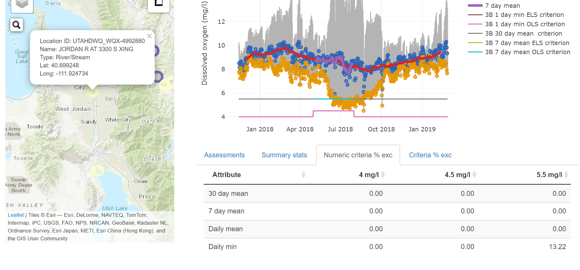 The purpose of the high frequency DO app is to view time series of the data, zoom in to specific time periods of interest, and review exceedance frequencies of the different standards. The data are built into the app, so any comments or notes need to be written up in a spreadsheet or document and sent to the IR Team via Trello or email.