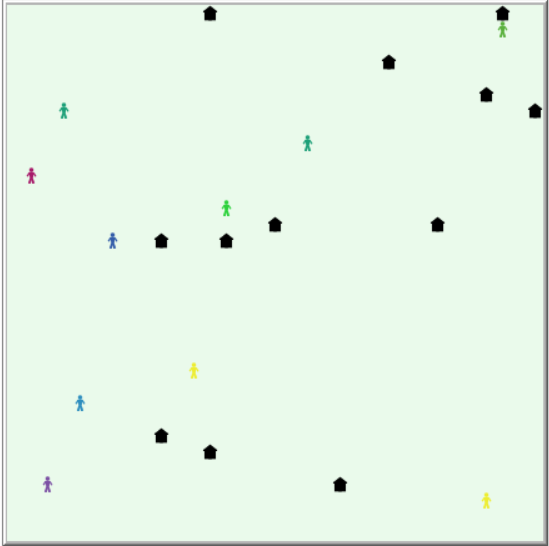 El modelo tiene agentes, cada uno de los cuales tiene una lista de compras y hay un número de tiendas cada una de las cuales vende un solo tipo de producto que puede ser comprado por los agentes