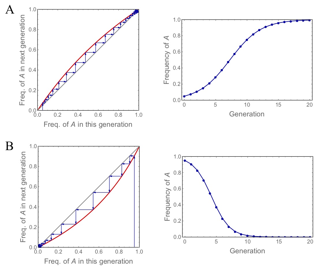 Fig. (4) applies the graphical method to our model and shows two example dynamics for positive and negative selection on \(A\). The app below allows you to explore the dynamics of natural selection in an interactive manner.