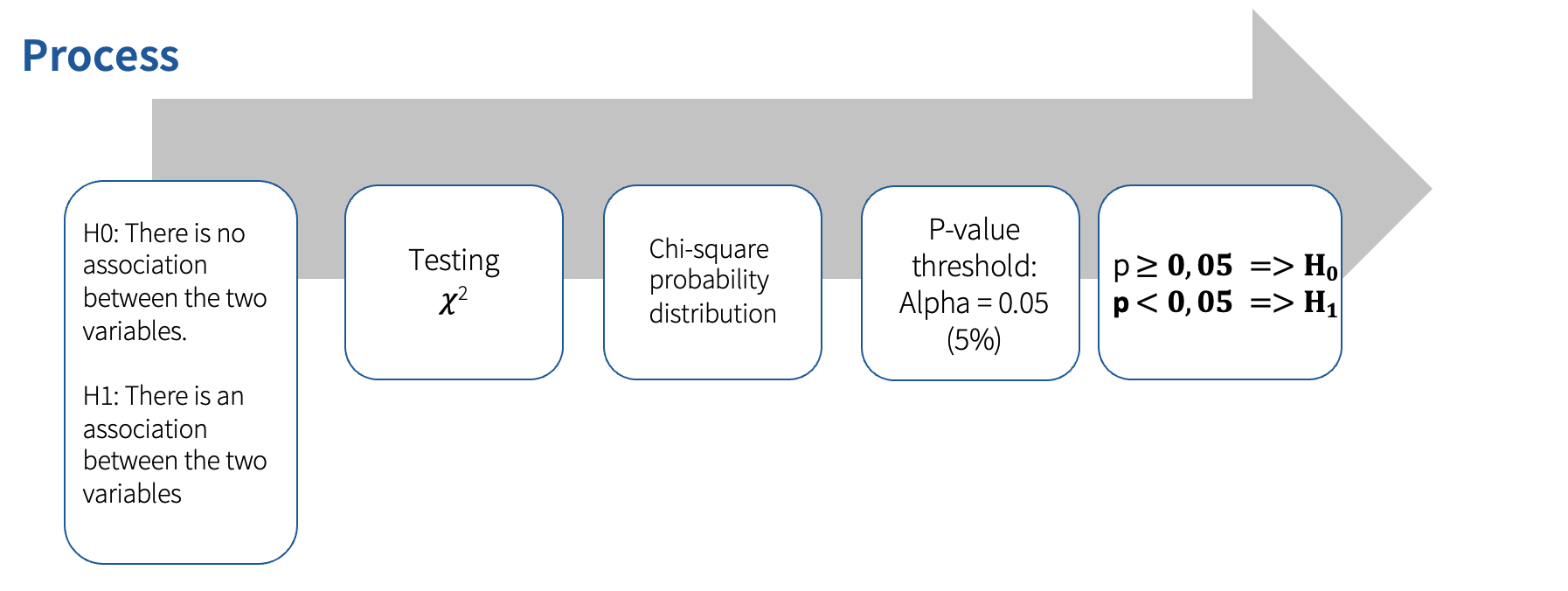 The Chi-square test analyzes whether there is an association between two categorical variables (those are non-metric variables that have nominal or ordinal scale). The observed frequencies are compared with theoretically expected frequencies. The strength and direction of the correlation are then determined.