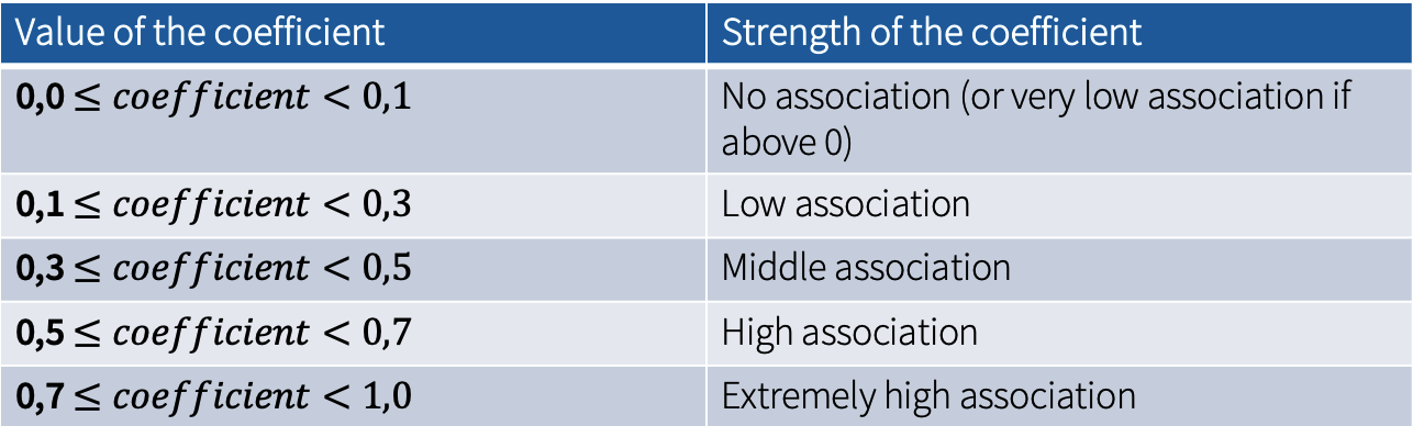 - Cramer’s V: used for all table sizes