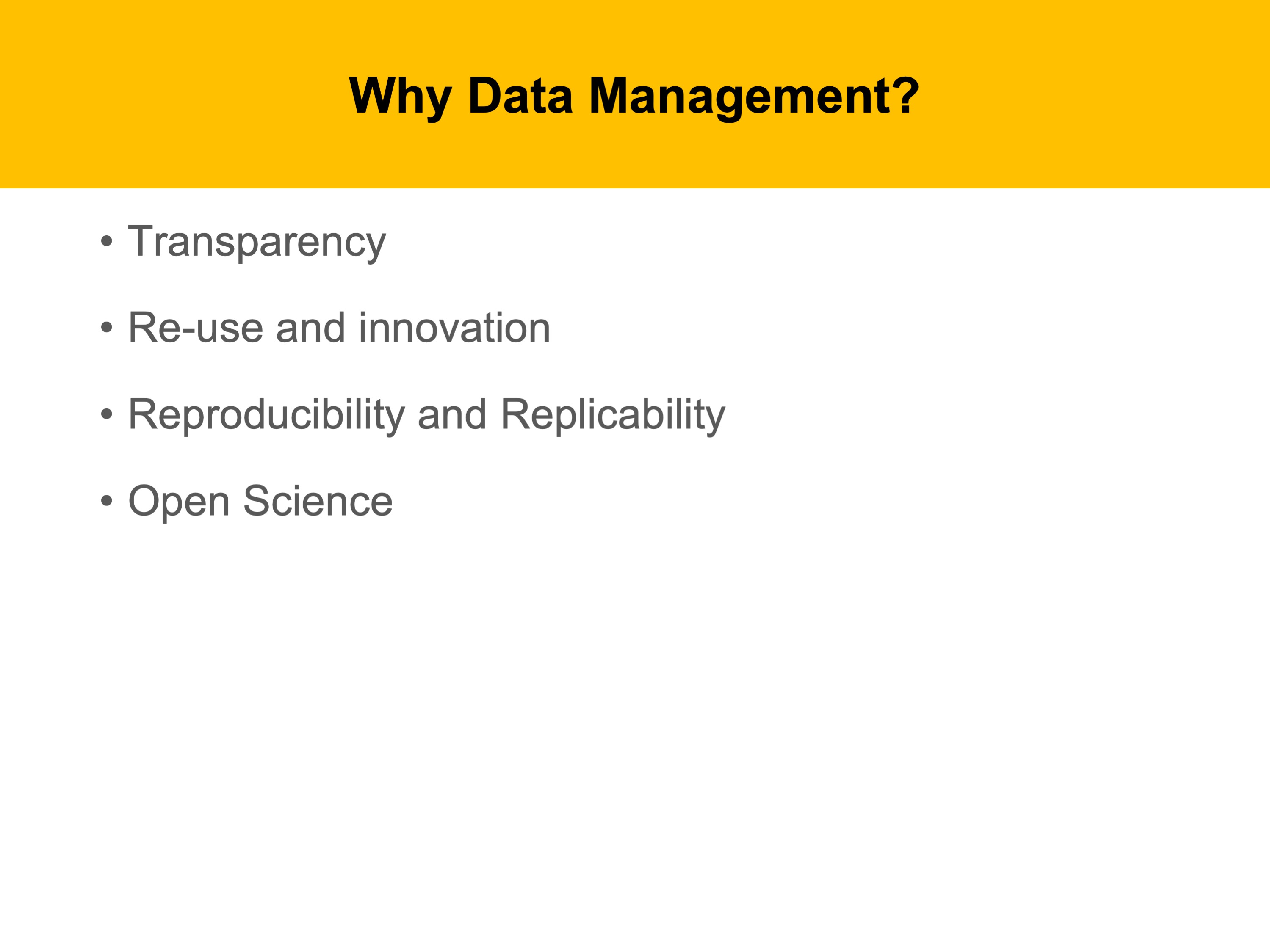Why are we talking about data management in the first place? There are a number of factors that have led to people talking about good data management. We are going to learn today about some of the mandated reasons, and also some personal practical reasons you should care about how you manage your data.