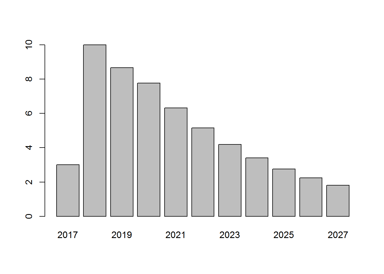 discount[1] 1.0000000 0.9090909 0.8264463 0.7513148 0.6830135 0.6209213 0.5644739 [8] 0.5131581 0.4665074 0.4240976 0.3855433 Note that the discount rate doesn’t apply to the first year (2017). Then a dollar in 2018 will be worth $0.909 and so on.