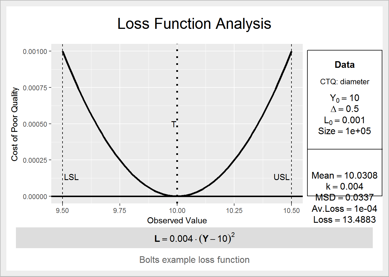 ss.lfa(ss.data.bolts, "diameter", 0.5, 10, 0.001,lfa.sub = "Bolts example loss function",