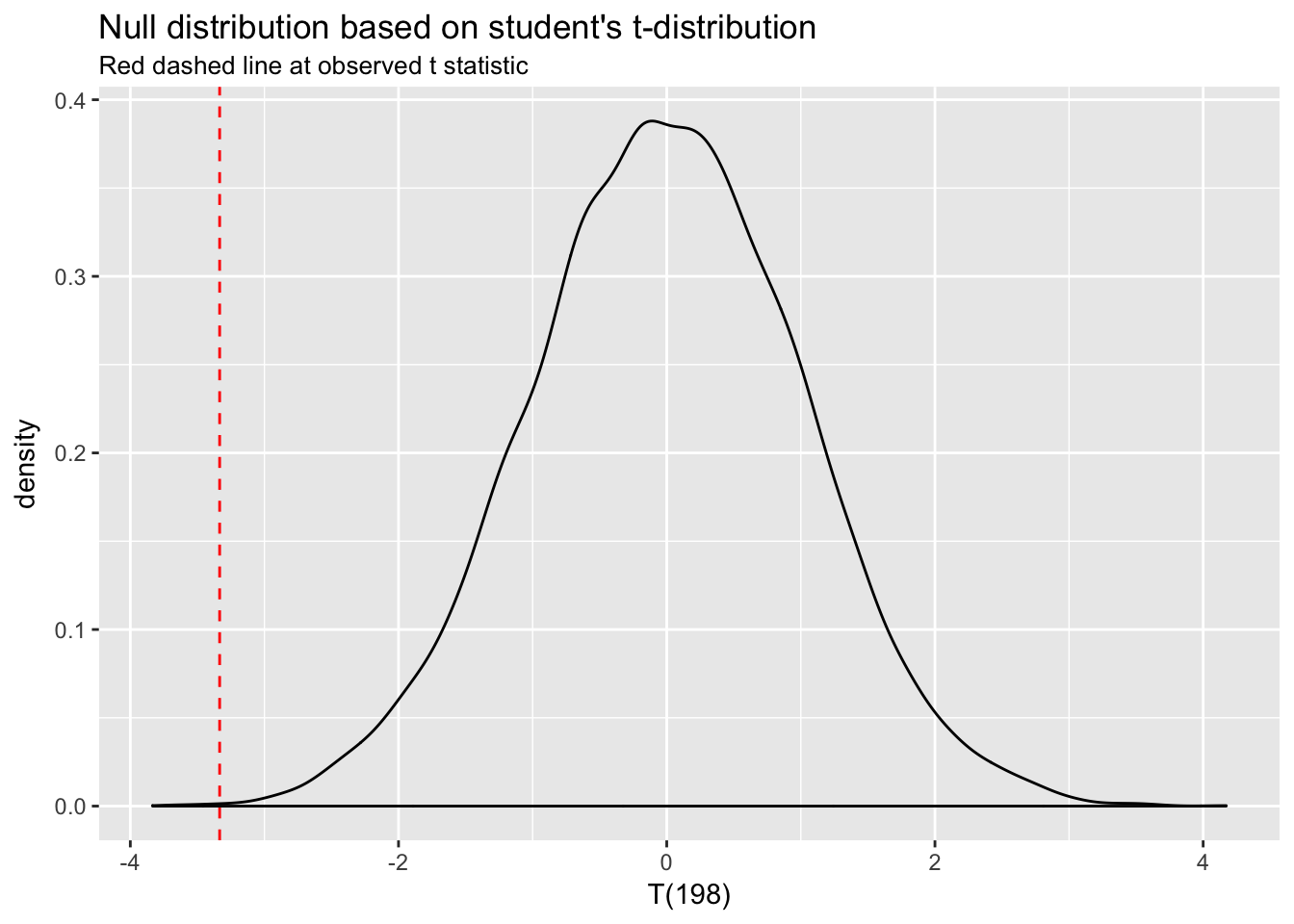 It does. The null distribution for a t-test is the \(t\) distribution with \(n_1 + n_2 - 2\) degrees of freedom.24 Let’s simulate values for the null distribution for T(198) and add the \(t\) statistic: