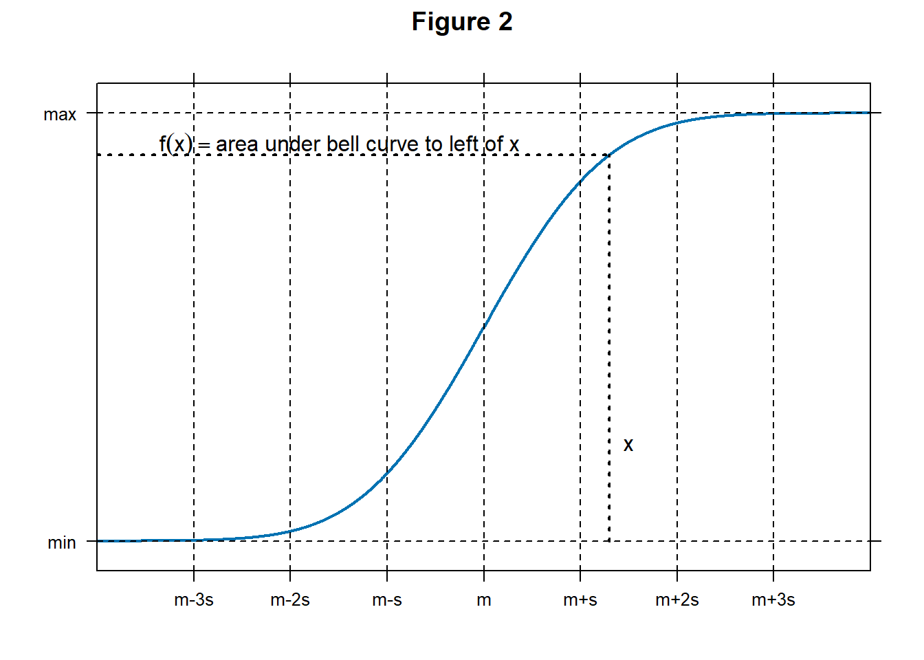 The value \(s\), referred to as the “standard deviation” or “spread”, is a measure of spread or rate. High values of \(s\) imply a slower incline while small values indicate a faster incline. When you plot the pnorm function as in Figure 2, you should note that at the input \(m + s\), the output \(f(m + s)\) is about two-thirds of the way up from the center output, \(f(m)\), to the max output. (This is important for model approximation.)