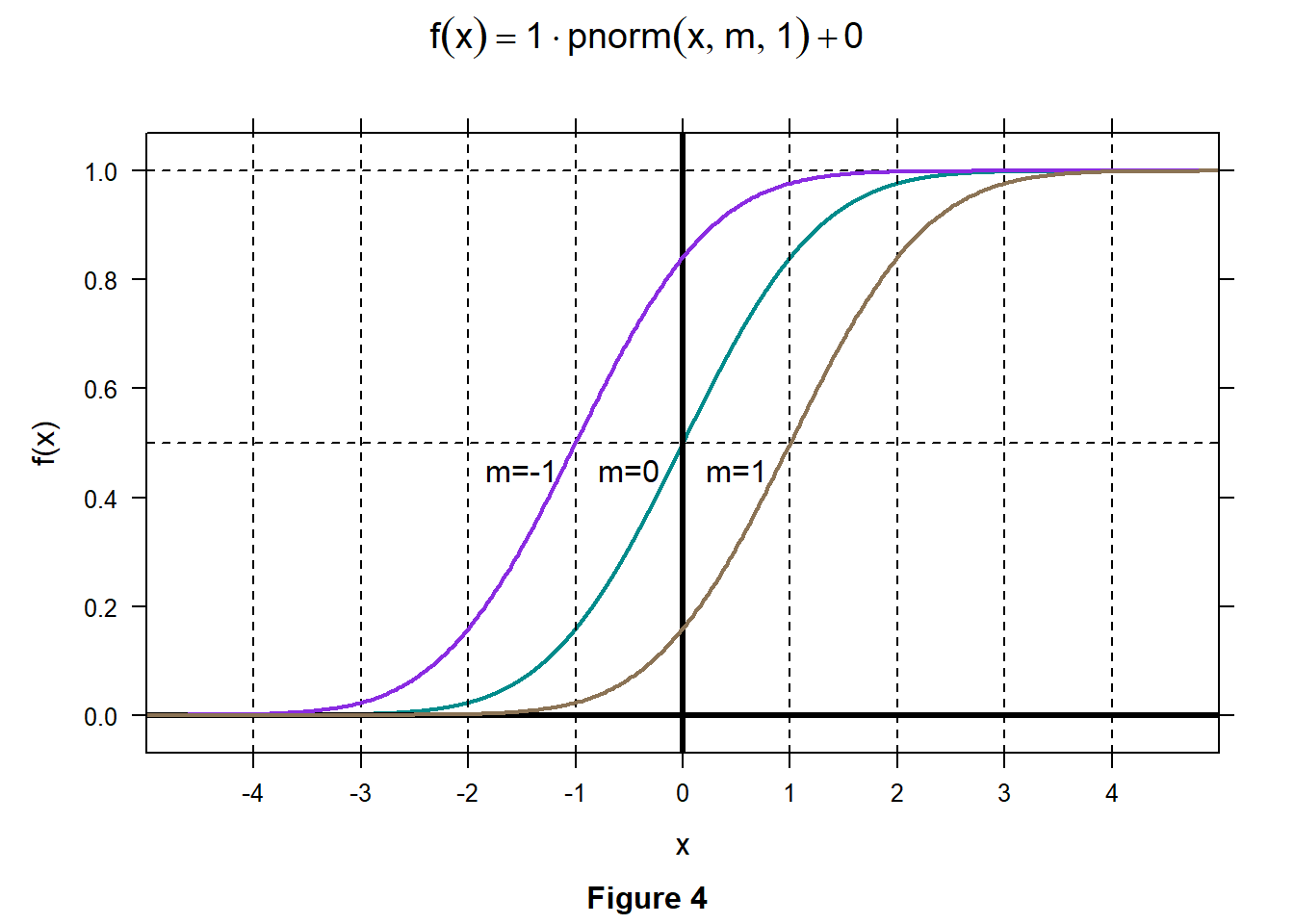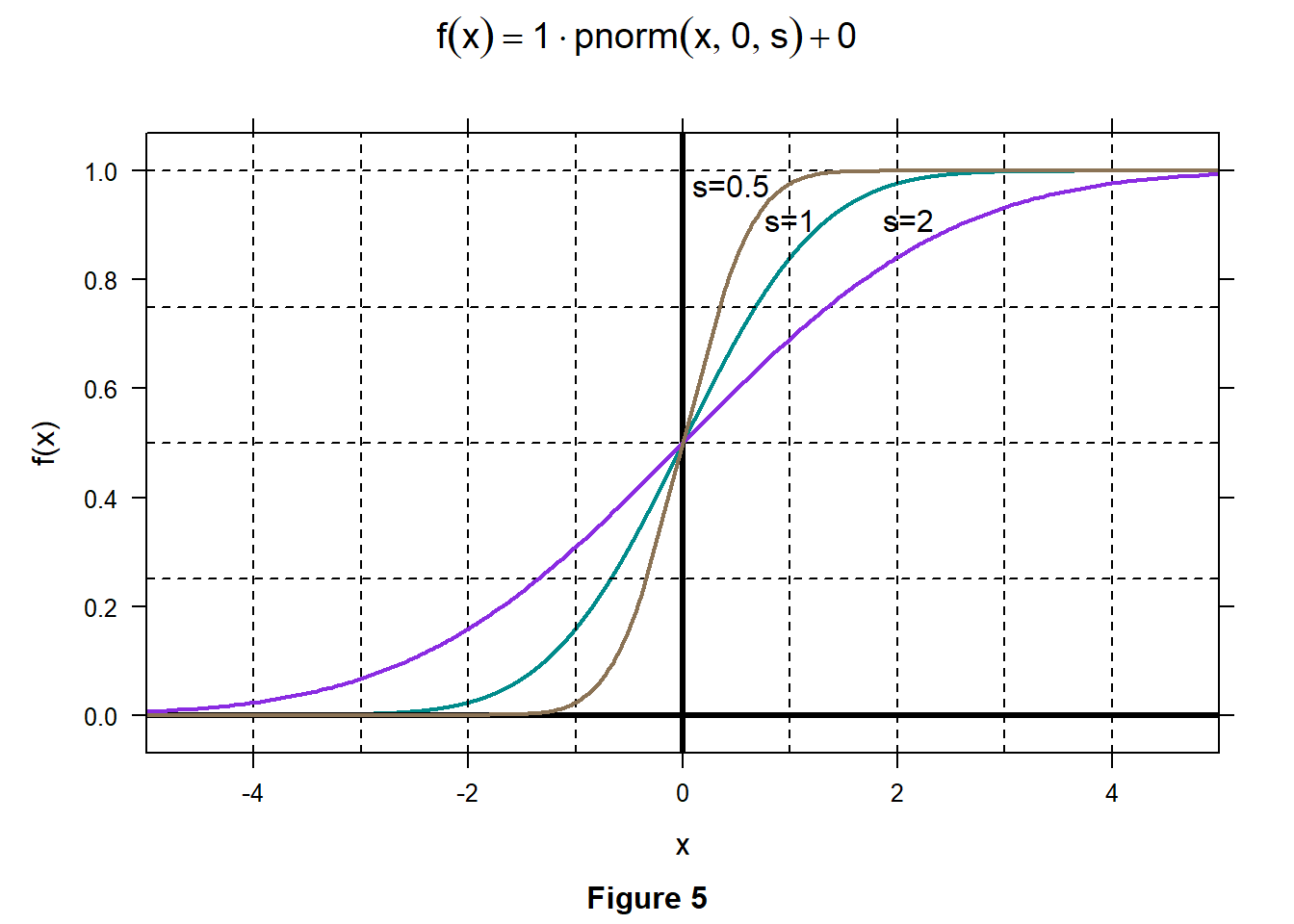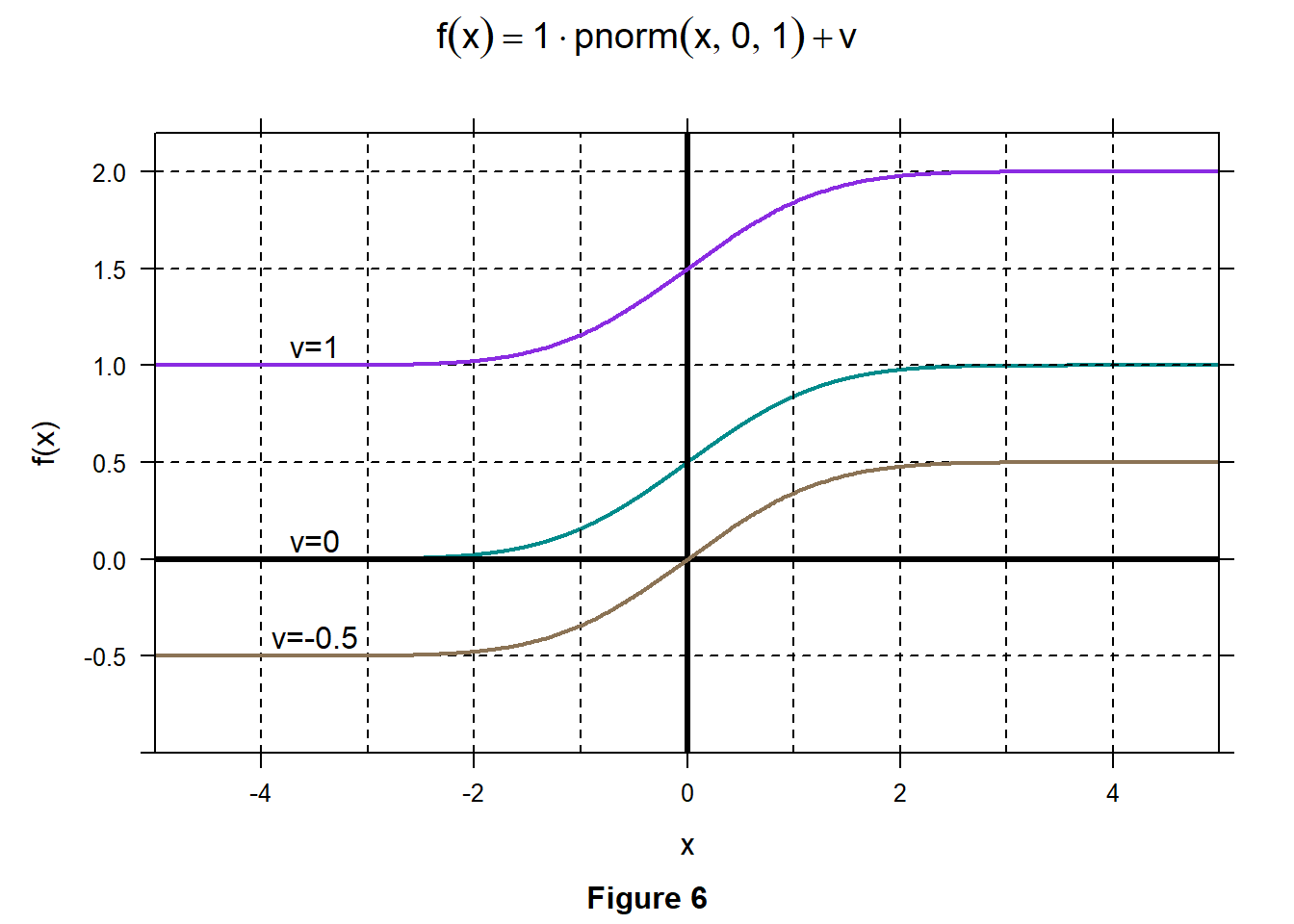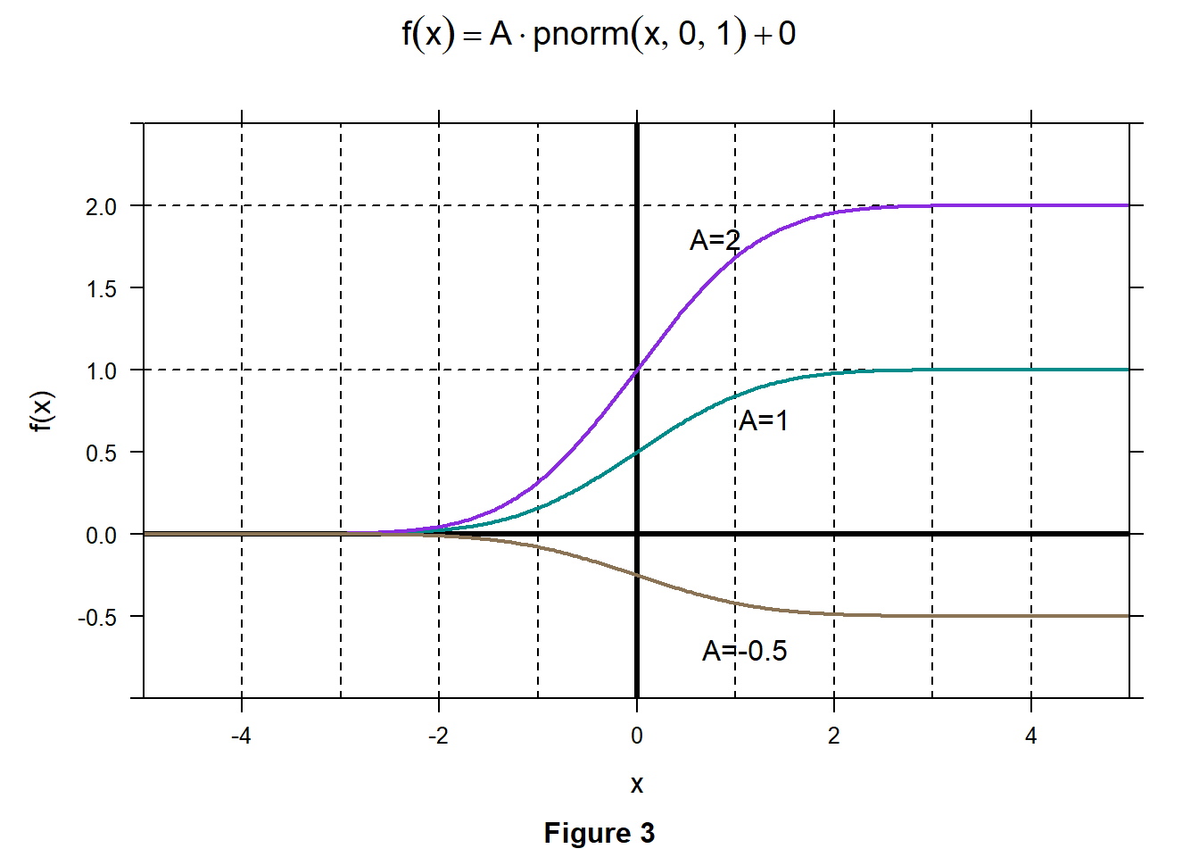 Figures 3-6 below illustrate how “\(f(x) = A \cdot \text{pnorm}(x,m,s) + v\)” changes as we modify each of the parameters. Default parameter values are set to \(A = 1\), \(m = 0\), \(s = 1\), and \(v = 0\).