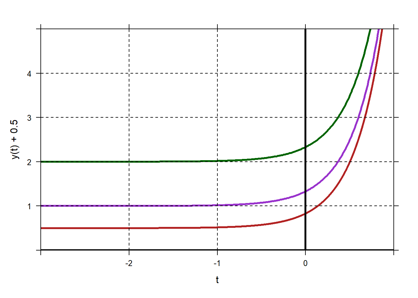 ## function (t, C = 0) ## { ## exp(3 * t)/3 + C ## } ## <environment: 0x00000291dc19f318>y=makeFun(1/3*exp(3*t)~t) plotFun(y(t)+0.5~t,tlim=c(-3,1),ylim=c(0,5),lwd=3,col="firebrick") plotFun(y(t)+1~t,add=TRUE,lwd=3,col="darkorchid") plotFun(y(t)+2~t,add=TRUE,lwd=3,col="darkgreen") mathaxis.on() grid.on()