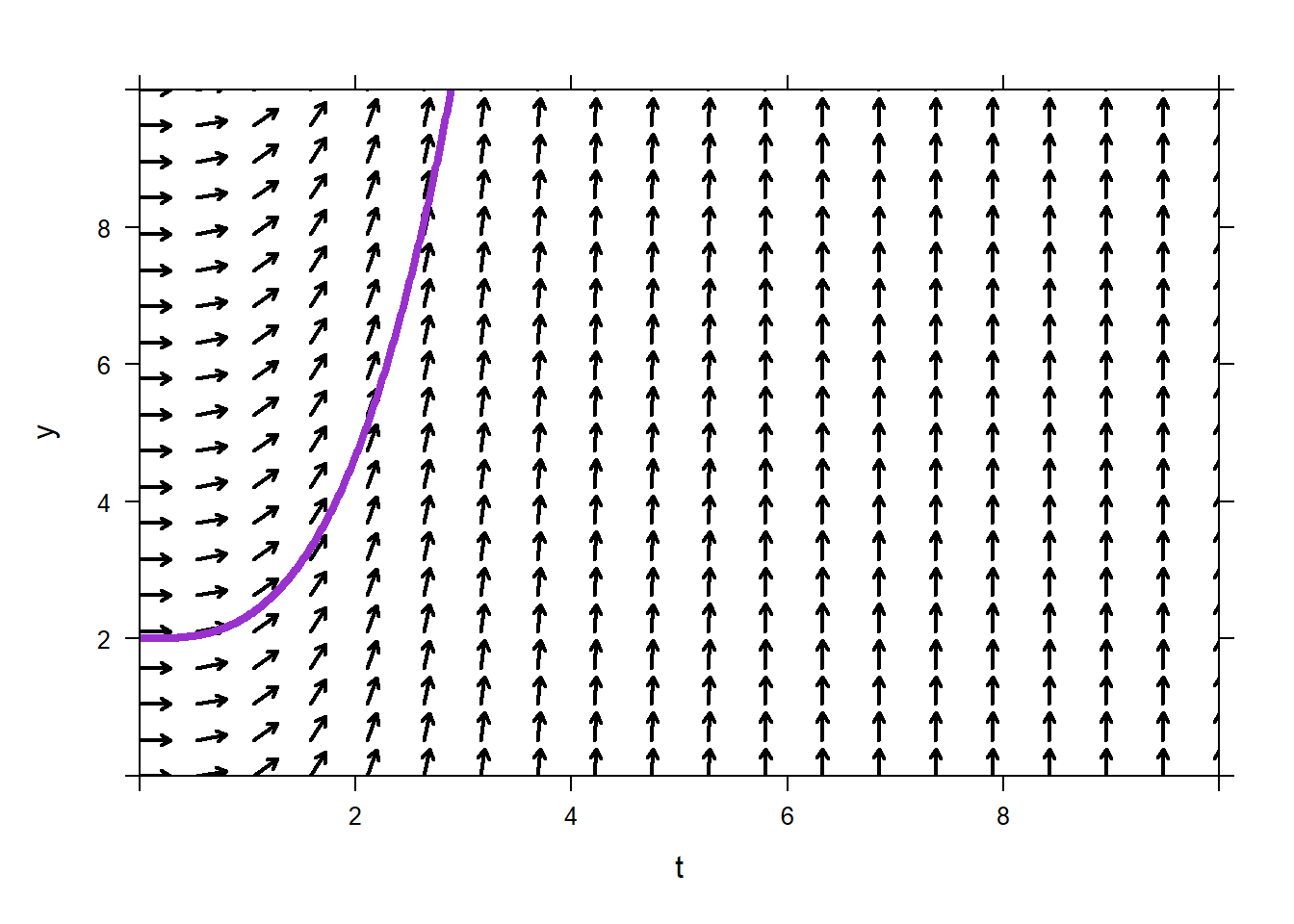 plotODEDirectionFieldshould be very familiar by now. Adjust the \(t\)-axis withtlim=. Adjust the \(y\)-axis withylim=. Adjust the color withcol=.Now, pick an initial condition, e.g., \(y(0) = 2\), and use the direction field to sketch the solution by hand. Since you know that the vectors tell you the slope of the tangent line of the graph of the solution, you just “follow the arrows”. This is a lot like dropping a volleyball into a river (vector field) and watching the path (solution) taken by the volleyball. The spot where the volleyball first lands in the river is the “initial condition.”