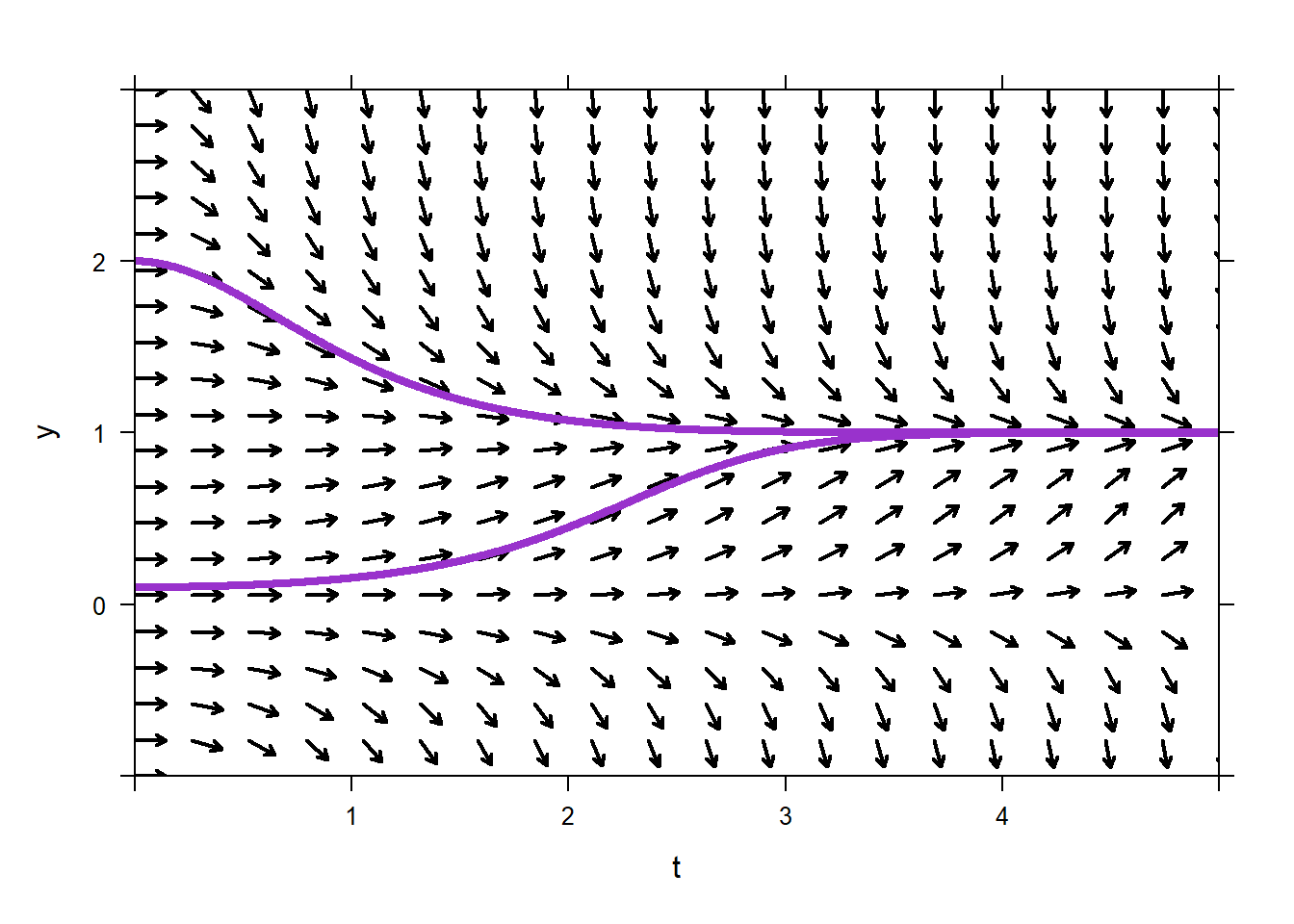 Repeat the exercise: sketch a few vectors by hand, then make a direction field using R, then sketch a specific solution corresponding to an initial condition, then use R to sketch the solution corresponding to the initial condition, for another ODE, this one should have \(y\) on the right-hand side of the ODE. For example, something like: \[y'=ty(1-y)\] \[y(0)=0.1\] \[y(0)=2\] The only difference now is that in order to evaluate \(y'\), you’ll need to involve the \(y\)-coordinate of the base points of your vectors. Otherwise, it is exactly the same.