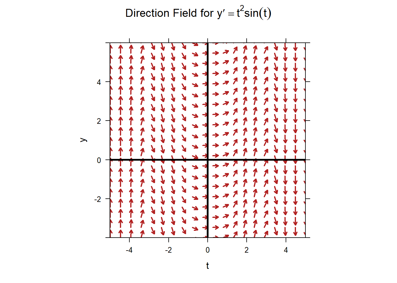 A direction field for the ODE \(y'=t^2\sin(t)\) is shown below.