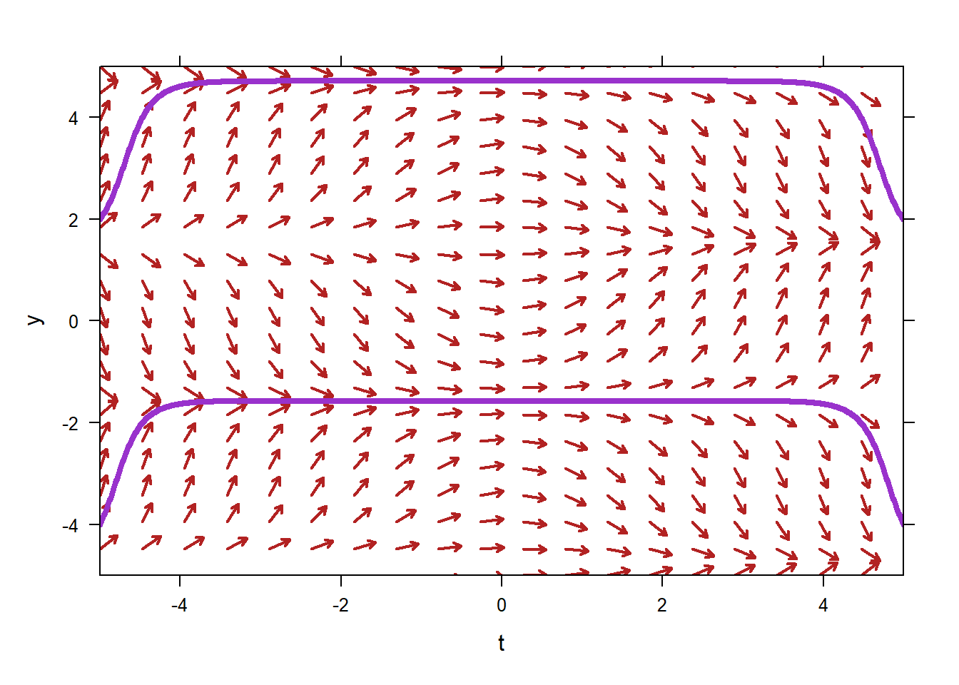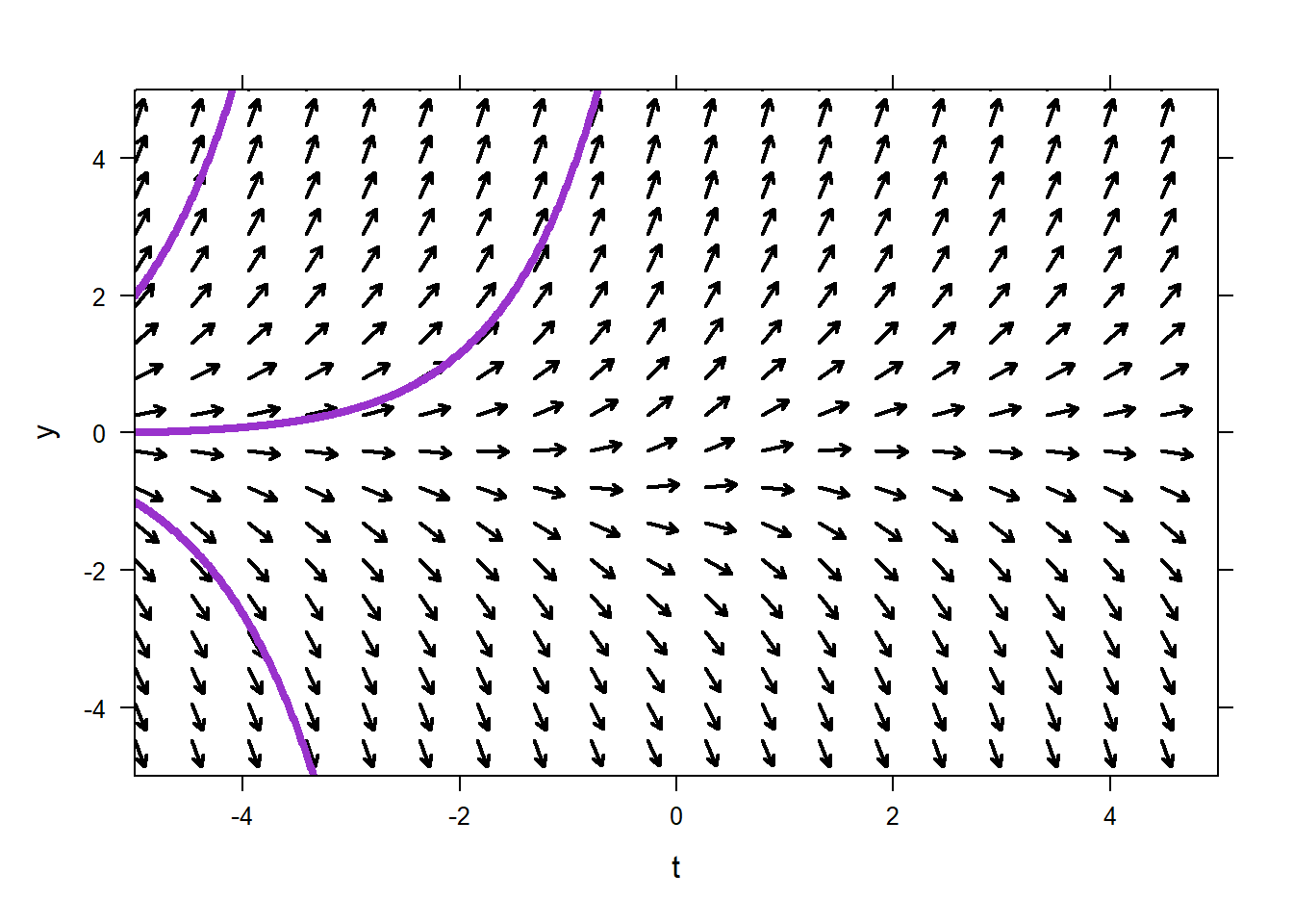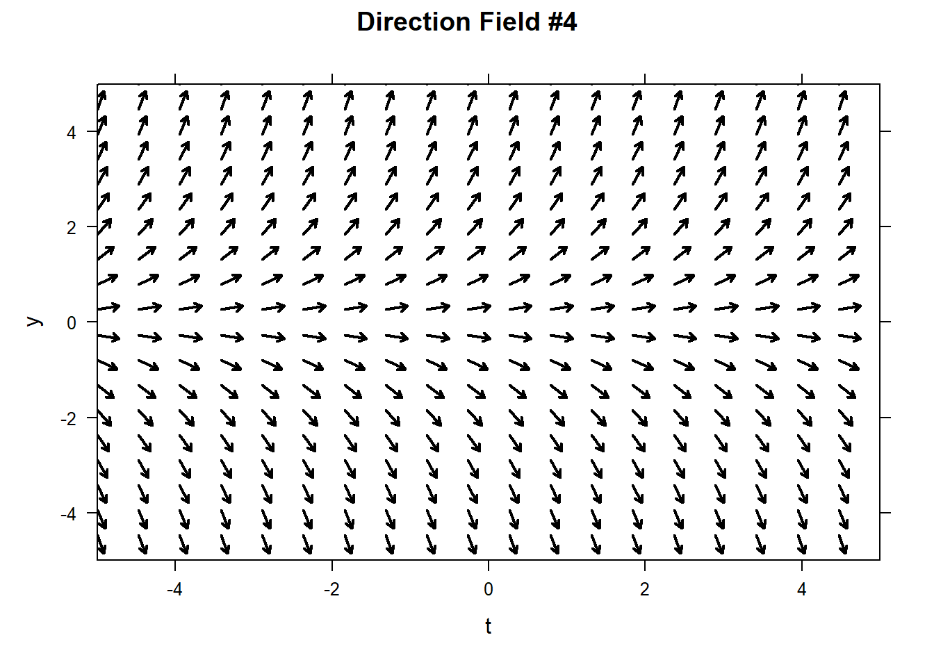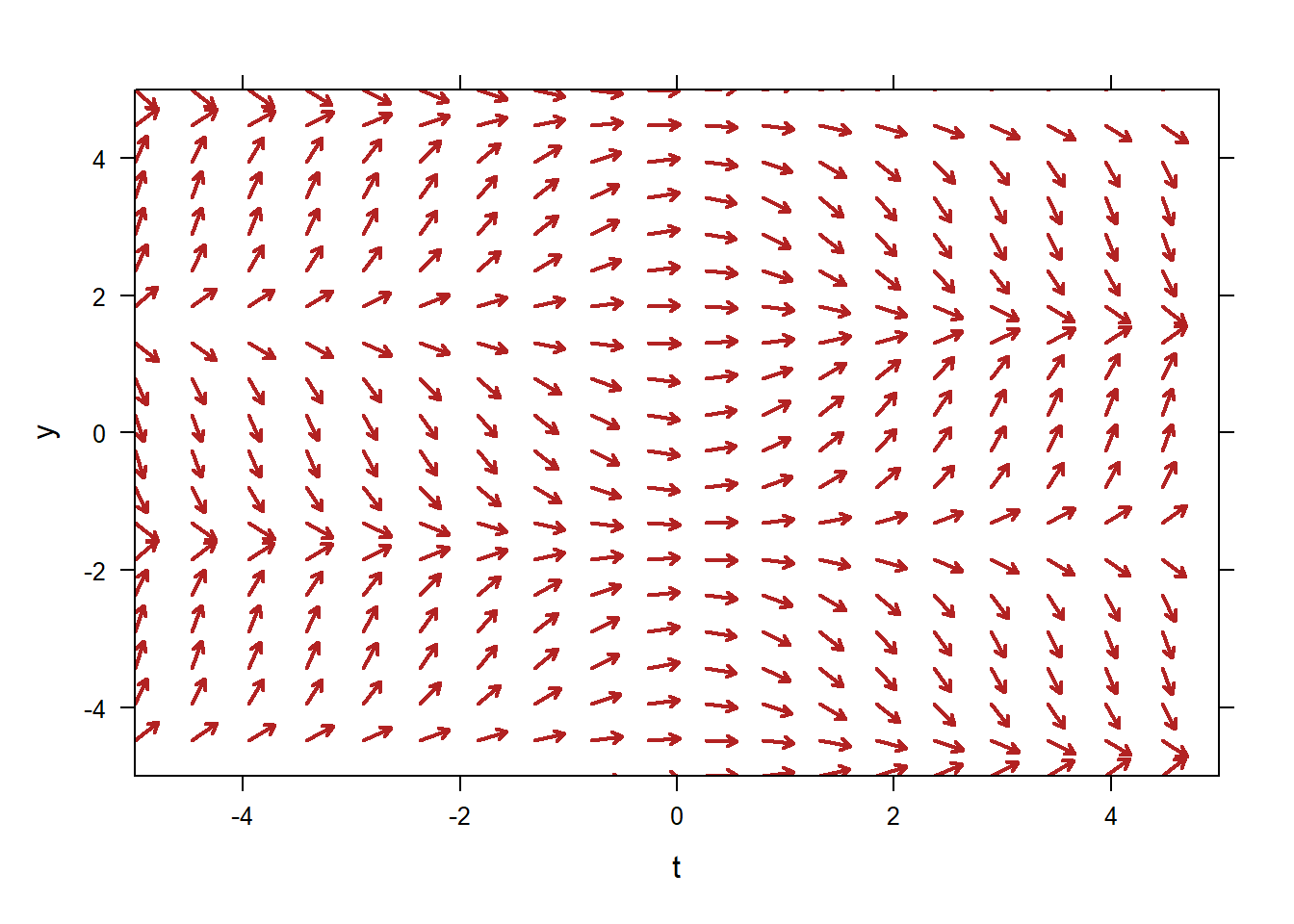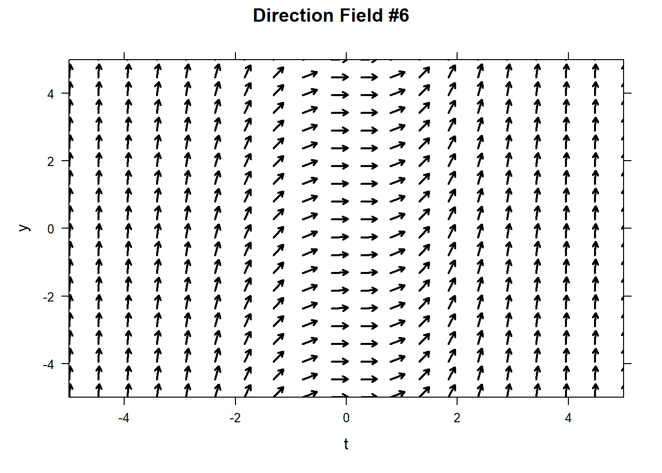 This will obviously become tedious. The command plotODEDirectionField will create a direction field for you. The command below produces a complete vector field. Note that in order to tell the command that our ODE is