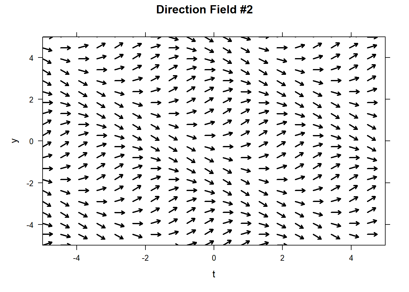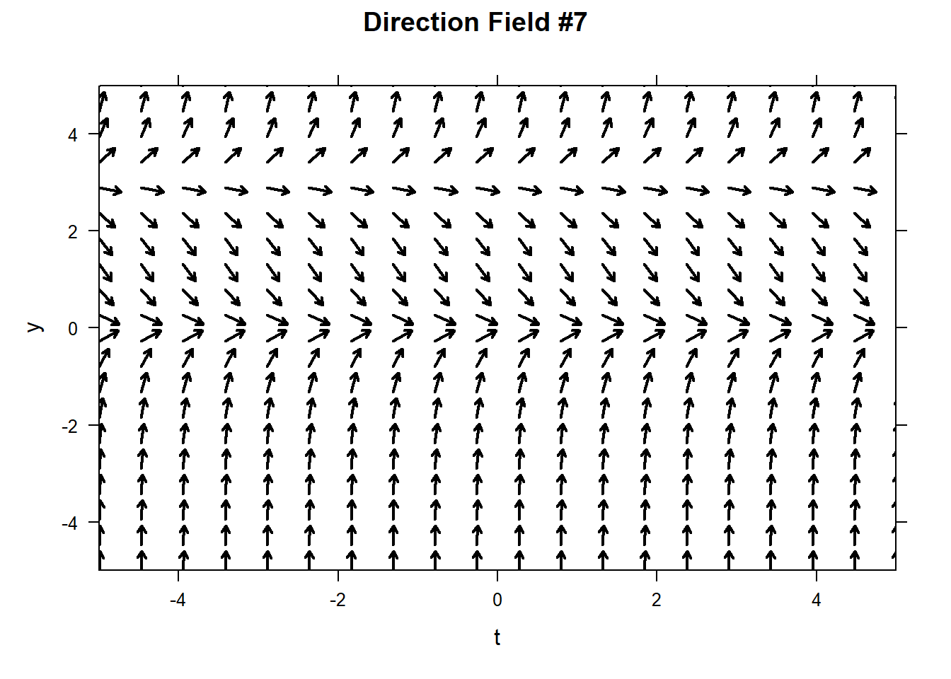 One interesting aspect of pure-time ODE is that their direction field does not vary in the \(y\)-direction, since by definition the slope of all solutions depend only on \(t\). Below are two direction fields for two different, unspecified, ODEs. We can be sure that the ODE specified on the left is pure-time, because the vectors do not vary slope in the \(y\)-direction. On the other hand, the ODE represented on the right must not be pure-time.