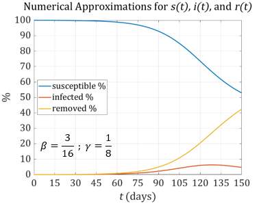Notice the significant differences in the graphs. With \(\beta = \frac{1}{2}\) the maximum number of infections is approximately 6.5% of the total population. With \(\beta = \frac{7}{16}\) the maximum drops to about 3%. We can see the importance of accurately determining \(\beta\) and \(\gamma\).