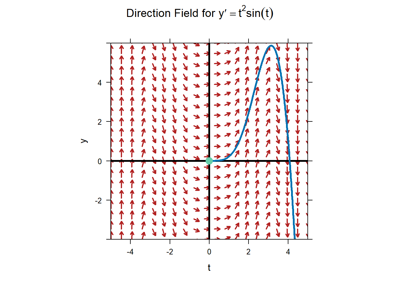 A direction field for the ODE \(y'=t^2\sin(t)\) is shown below.