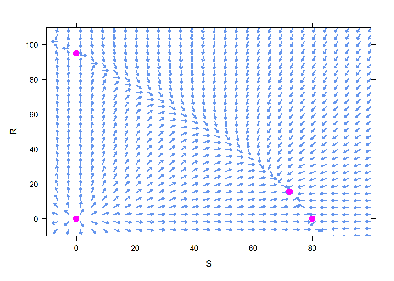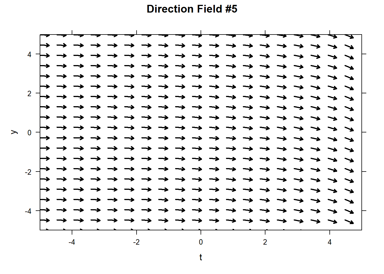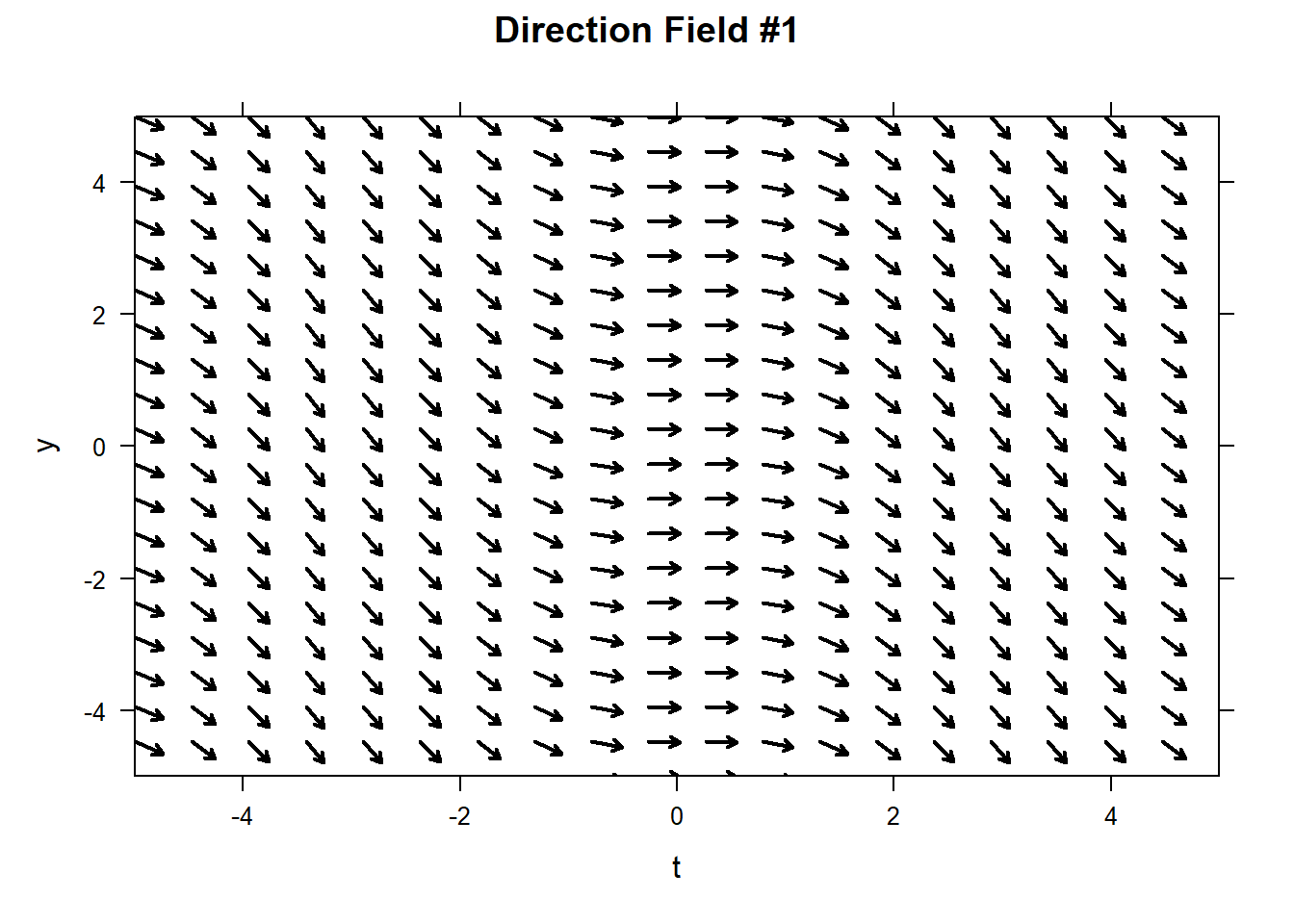This will obviously become tedious. The command plotODEDirectionField will create a direction field for you. The command below produces a complete vector field. Note that in order to tell the command that our ODE is