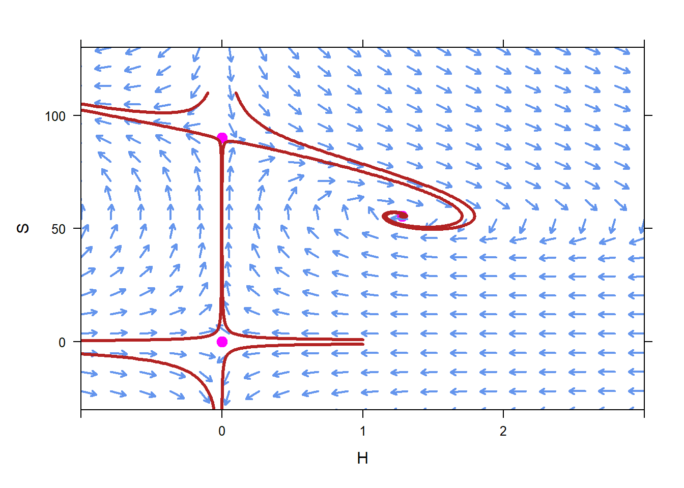 Once you have plotted the direction field, plot solutions for the following ICs: \((-2,0)\), \((-2,2)\), and \((-2, - 1)\).
