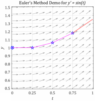 As with plotODEDirectionField, we need only specify the right hand side of our ODE. We’ll also need to specify the initial condition for the problem, the step size (\(\Delta t\)), and the time over which to approximate the solution. To approximate a solution to