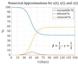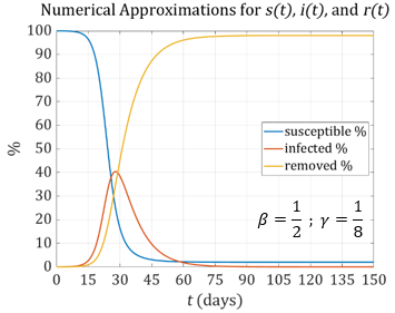 Notice the significant differences in the graphs. With \(\beta = \frac{1}{2}\) the maximum number of infections is approximately 6.5% of the total population. With \(\beta = \frac{7}{16}\) the maximum drops to about 3%. We can see the importance of accurately determining \(\beta\) and \(\gamma\).