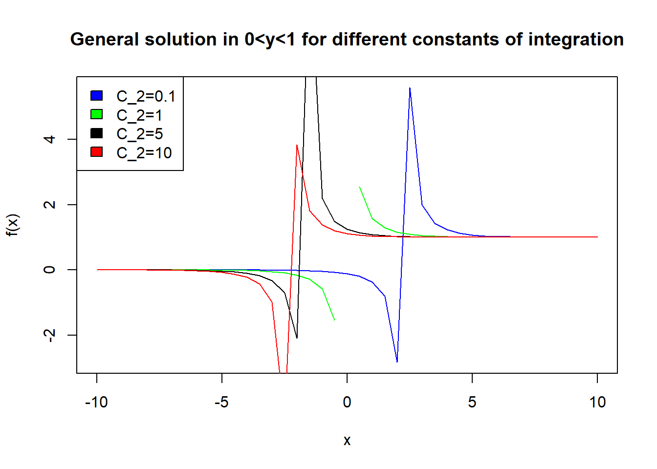Now, if \(\exp(x)>1/C_2\), i.e. \(x>-\log(C_2)\), then \(y>1\), and if \(x<\log(C_2)\), then \(y<0\). Hence we will have a vertical aymptote in \(y\) at \(x=-\log(C_2)\).
