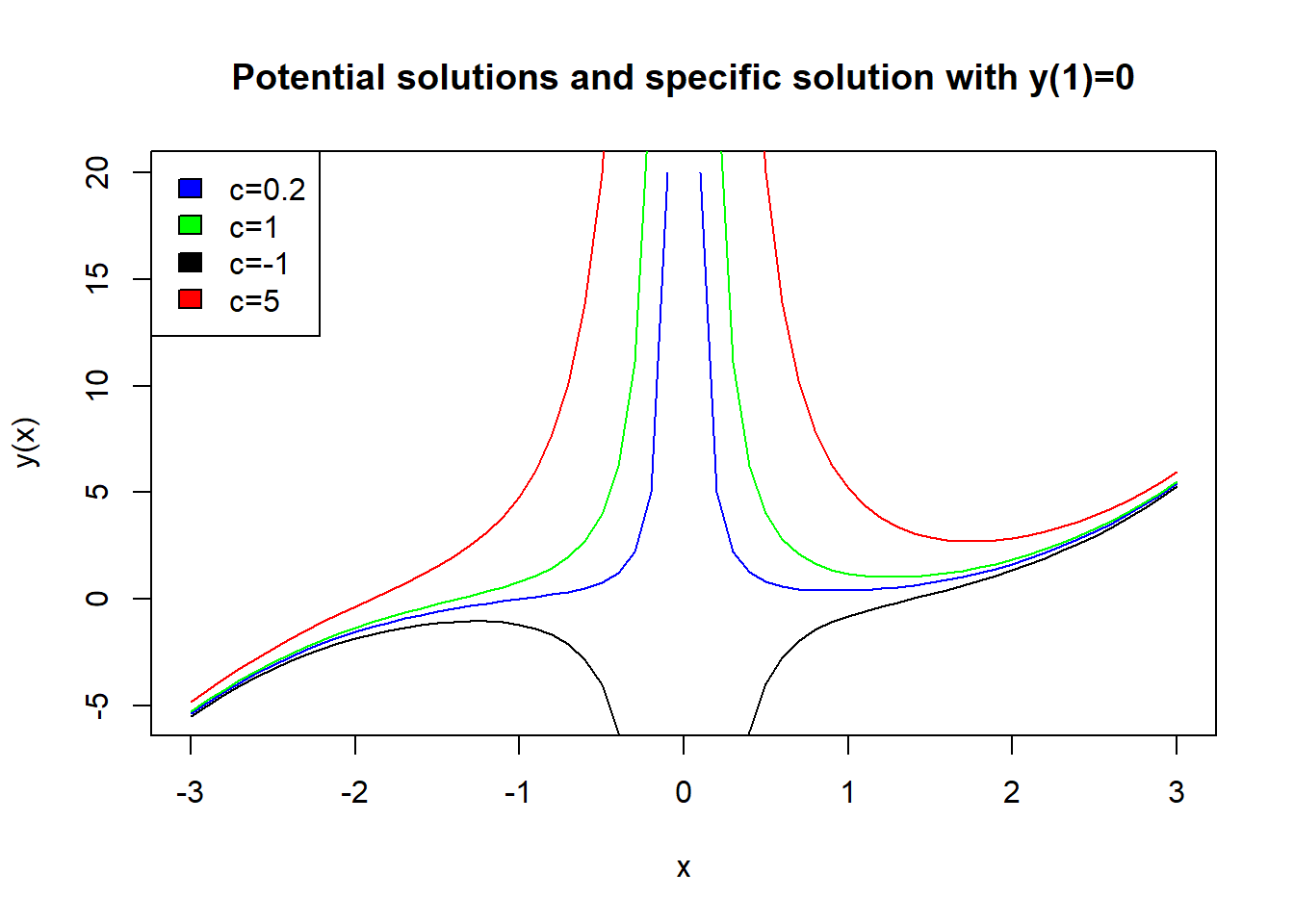 Remark IN the picture above you can see where the asymptotes are by the wierd jum in the graph. I have left this in, so that you can see how the solution changes from negative to greater than 1 as we move through \(-\log(C_2)\). The situation seen with the previous example is typical of separable equations. You always need to examine the case \(g(y)=0\) separately. Notice that if \(g(y)=0\) then \(y'=0\) thanks to the differential Equation (6.2). So the values \(y\) for which \(g(y)=0\) are constant stationary solutions of the equation.