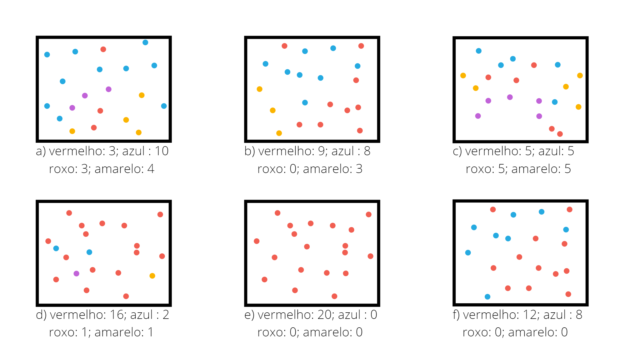A Figura @ref(fig:exgini) apresenta diferentes regiões com diferentes proporção entre duas classes. Considere a classe vermelha como a de referência.