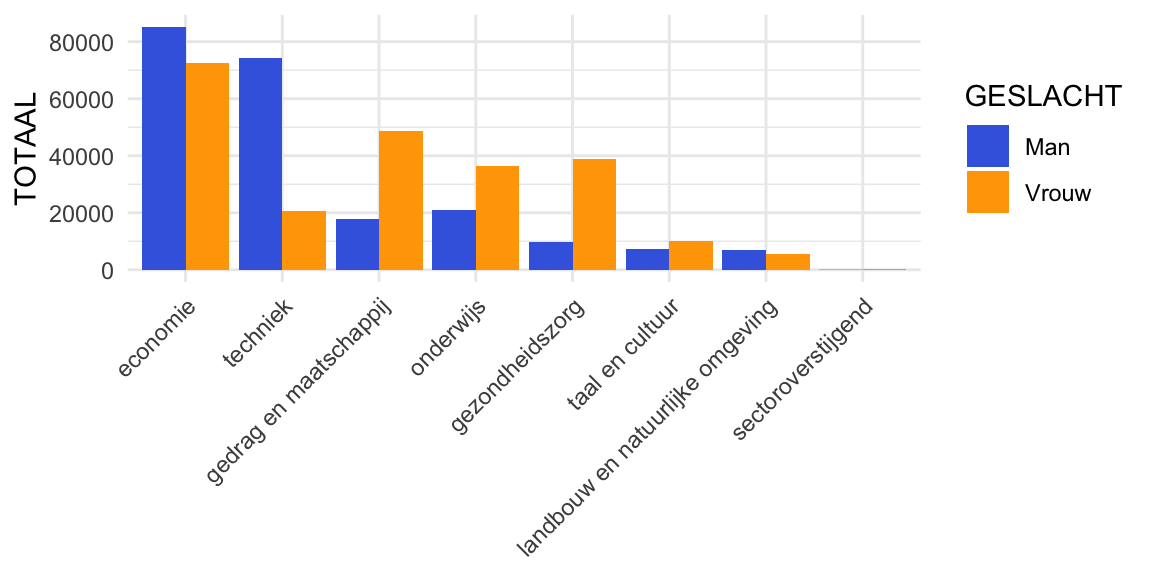 Figuur 3: Barplot dodged, aantal ingeschreven studenten per studierichting in academisch jaar 2018-2019 bij hbo-instellingen in Nederland uitgesplitst naar geslacht. Voorbeeld van bivariate analyse van verband tussen twee categoriale variabelen