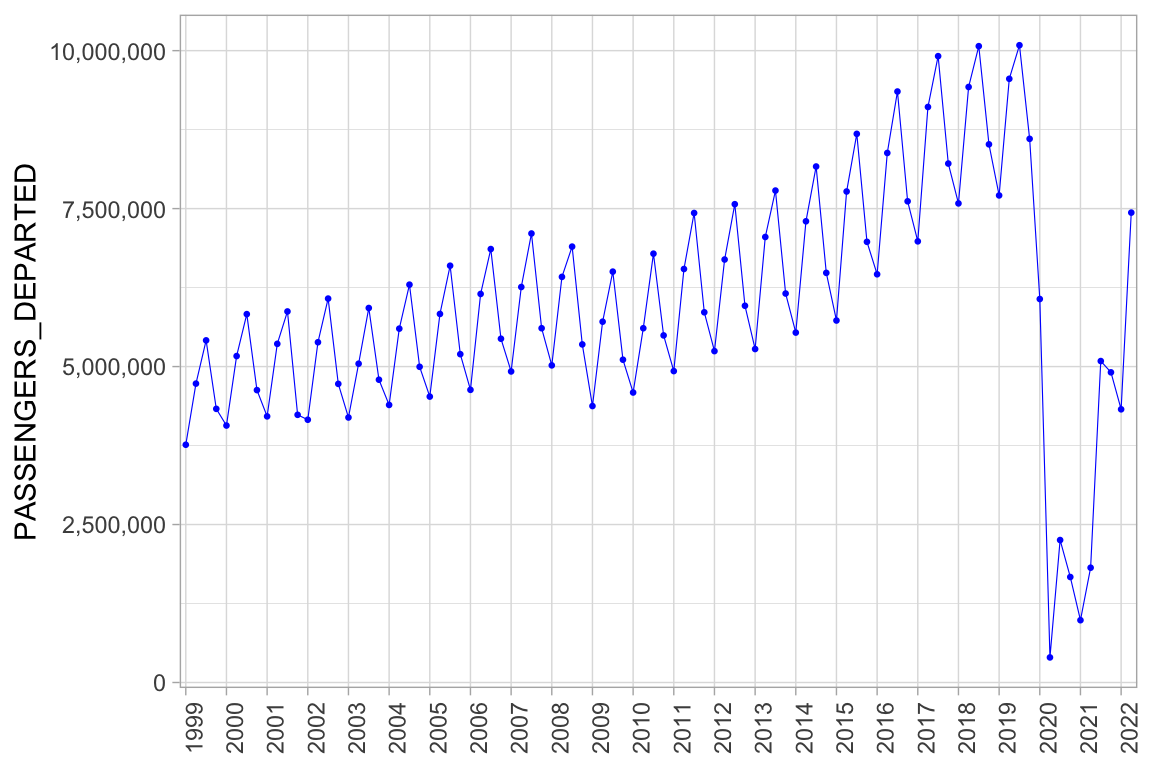 ggplot(aes(x = PERIOD, y = PASSENGERS_DEPARTED)) +