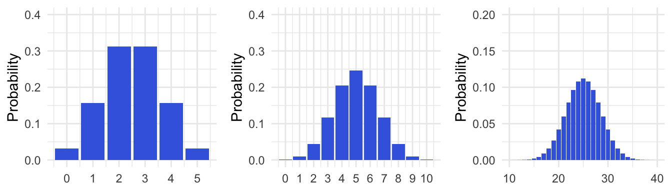 Note. The distributions sjhown are binomial distributions with 5, 10 resp. 50 trials with probabilty of a success 0.5.