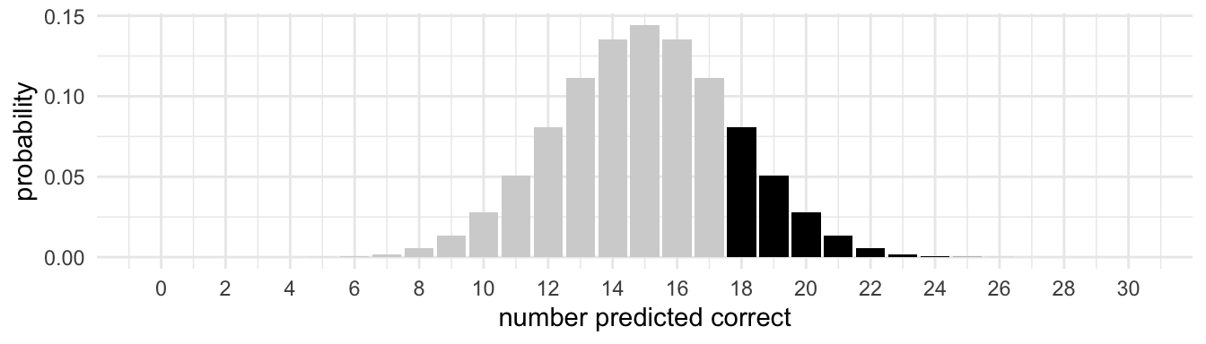 Note. Probability of 18 or more successes in black, in a binomial experiment with n = 30 and p = .5.