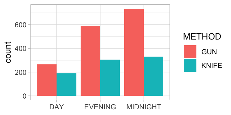 To analyse whether there is a relationship between the variables METHOD, a categorical variable with free unique values (GUN, KNIFE and OTHERS), and SHIFT a categorical variable with three unique values (DAY, EVENING, MIDNIGHT) a contingency table has been created.