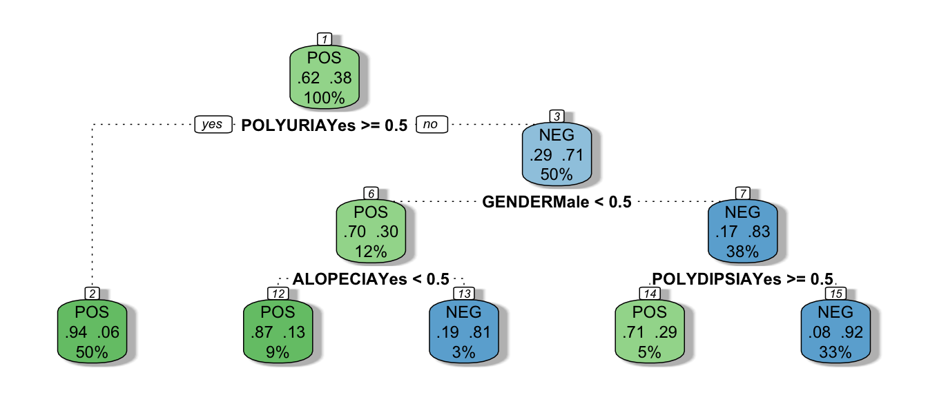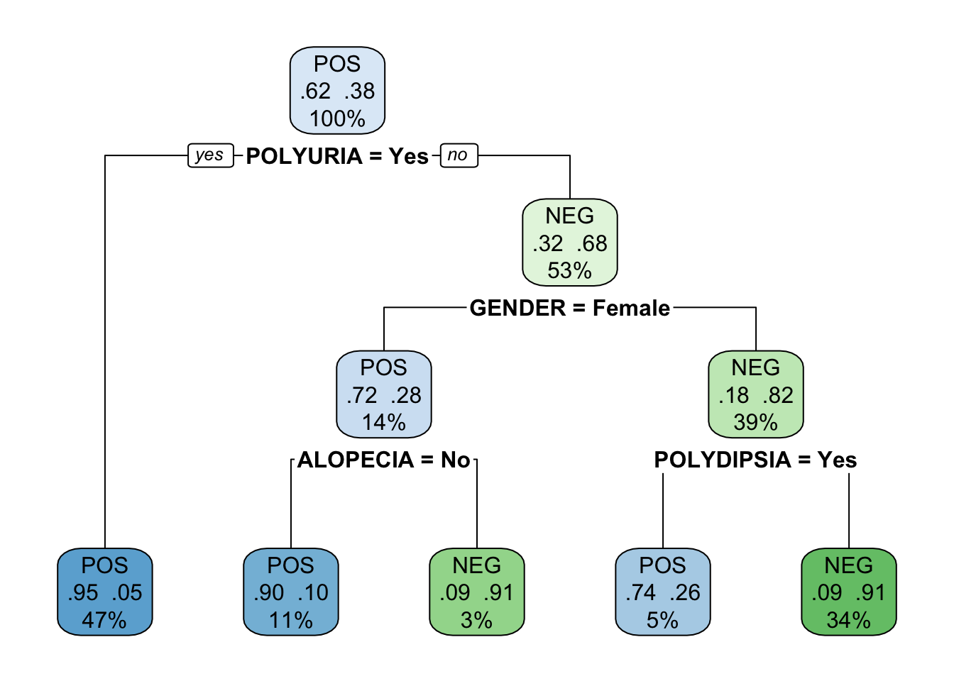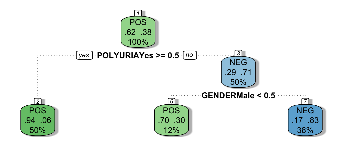 This is the default tree plot made bij the rpart.plot() function. Each node shows (1) the predicted class, (2) the predicted probability of NEG and (3) the percentage of observations in the node. It is possible to change the lay-out of the plots and/or to show other information in the nodes.