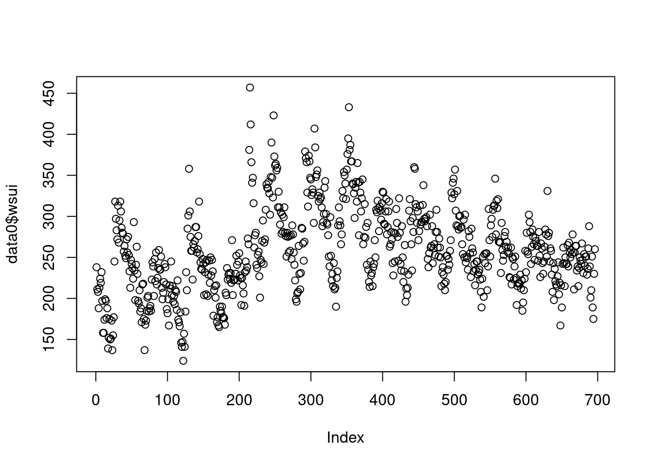plot(x, pm, type="l", col=grey(0.5), ylim=c(50, 140), xlim=c(0, 300))