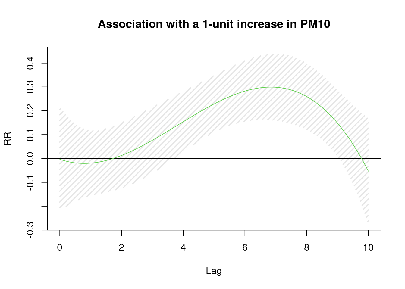 plot(pred1.pm, "slices", var=1, col=3, ylab="RR", ci.arg=list(density=15,lwd=2),