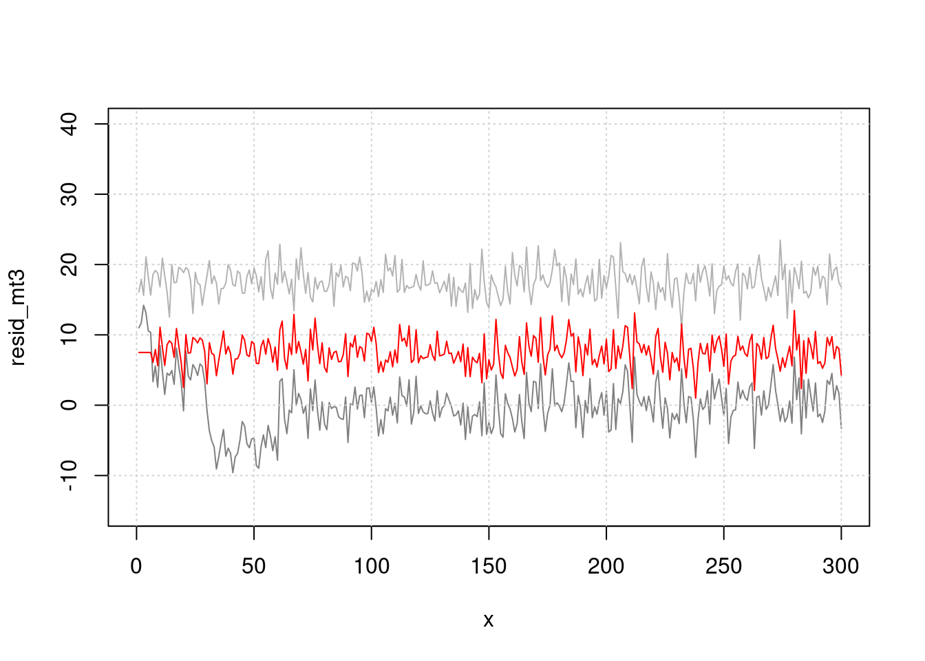 plot(x, resid_mt3, type="l", col=grey(0.5), ylim=c(-15, 40), xlim=c(0, 300))
