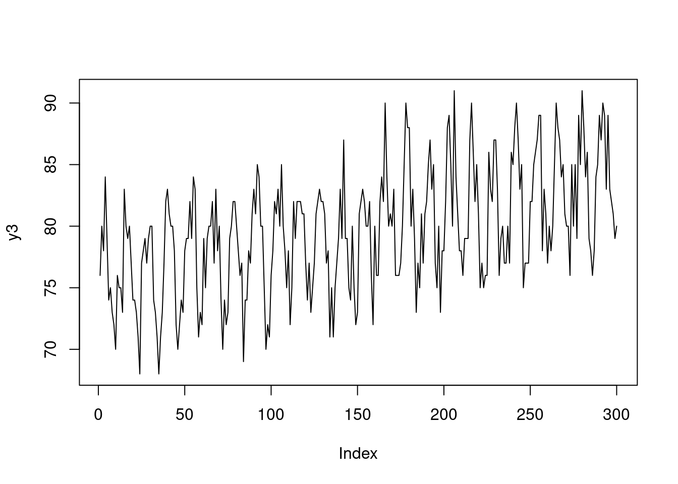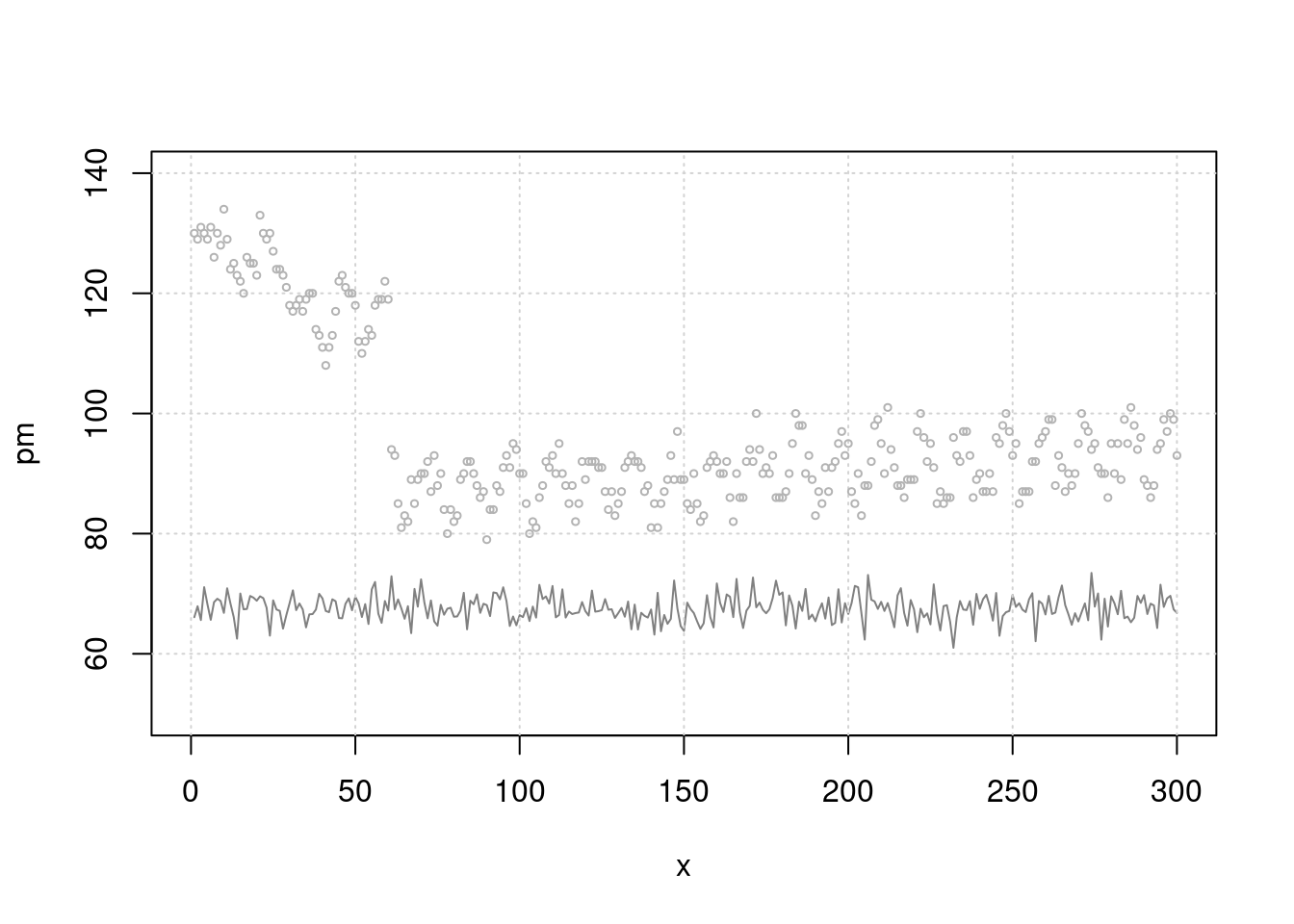 plot(x, pm, type="l", col=grey(0.5), ylim=c(40, 150), xlim=c(0, 300), cex=2)