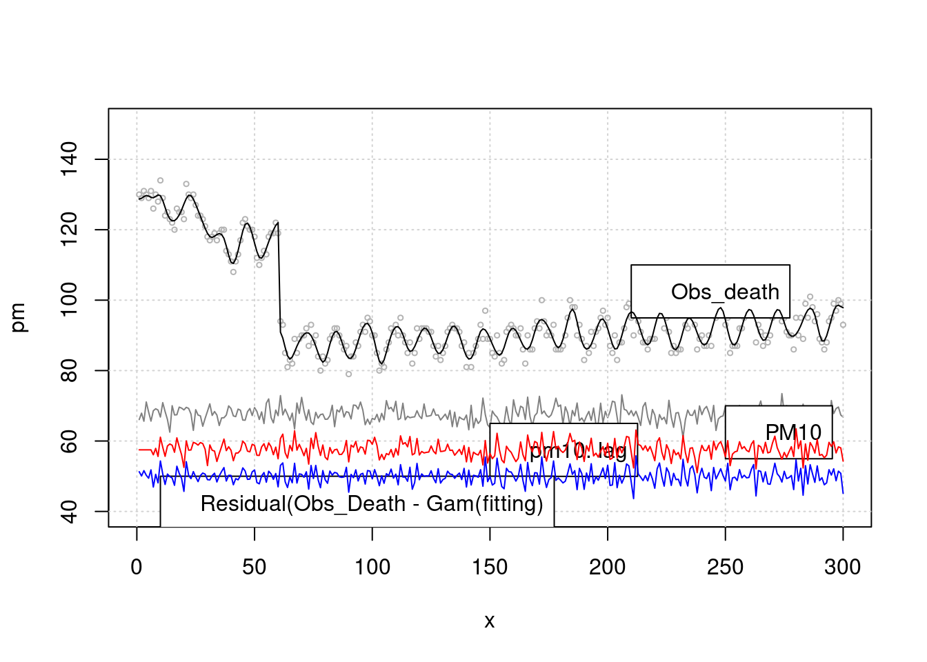 legend(x=10, y=50, 'Residual(Obs_Death - Gam(fitting)')