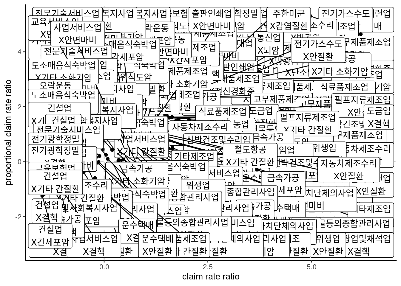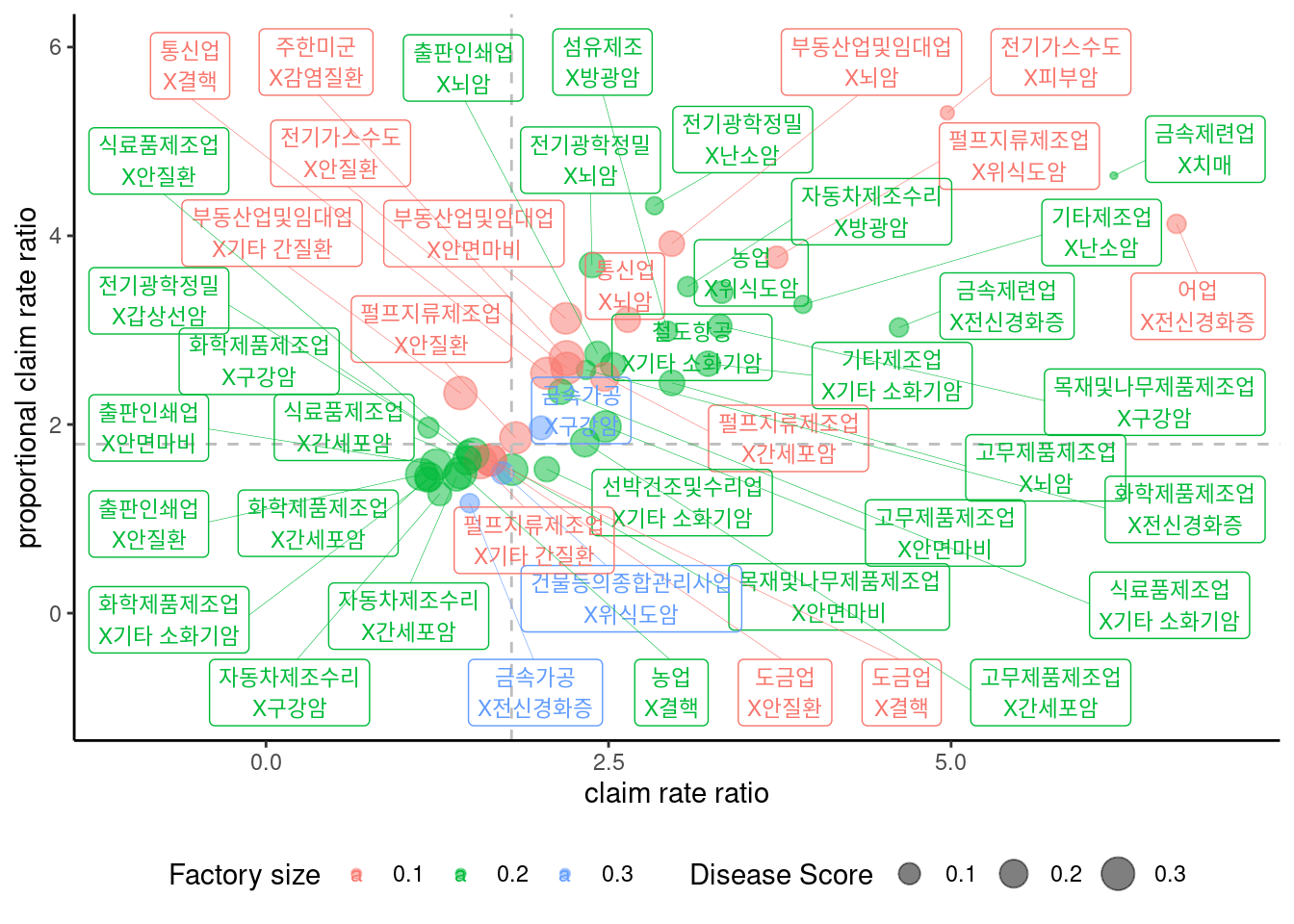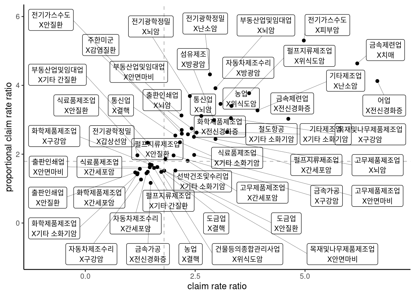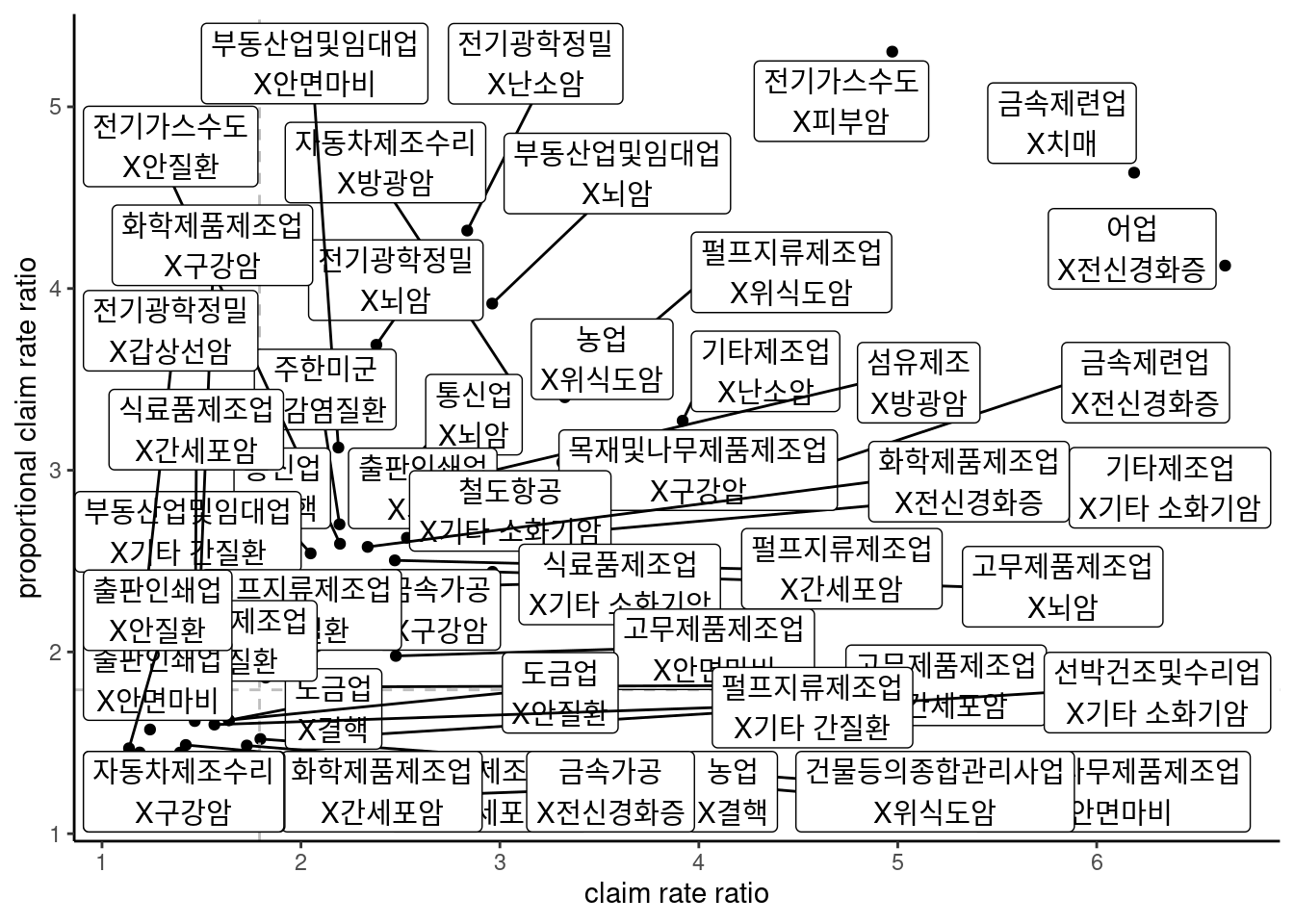 보건학에서 우선순위를 선정하는 경우를 상상해 보자. 여기에 특정 업종에서 특정 질병이 얼마나 발생하는지에 대한 가상의 자료가 있다. 여기에 두가지 산재발생률(특정업종 근로자에서 질병 발생률 = 질병발생수/특정업종 근로자수)과 산재 비례발생률(특정업종 근로자에서 전체 질병 대비 특정 질병 발생률)이 있습니다. 이것 자체의 의미는 보다는, 특정 업종 산재 발생률이 전체 업종 산재 발생률에 대해 얼마의 크기가 있는가와 특정 업정 특정 산재질병 비례발생률이 전체 업종에 비해 얼마의 크기가 있는지를 구하였습니다. 전자를 claim rate ratio (crr) 이라고 하고, 후자를 proportional claim rate ratio (pcr) 으로 명칭하겠습니다. 참고로 crr과 pcr의 장점은 crr의 경우 대표성이 있고 율의 개념이 들어간 비이므로 우리가 흔히 생각하는 위험도의 개념으로 설명이 가능합니다. 그러나 crr은 건강근로자효과에 매우 취약한데, 예를 들어 특정 집단이 손상으로 미리 사망하여 암이 발생하기 어렵다던가하면 암의 crr이 줄어들게 됩니다. 반대로 pcr은 율의 개념이 상이하여 우리가 아는 위험도의 의미로 해석하기는 어려우나, 위의 경우보다는 건강근로자효과에 보다 안정적일 경우가 있습니다. 예를 들어 각 업종별로 산재신청의 이유가 동일하다면 전체 산재신청중에 특정질병의 수이기 때문에 동일한 의미를 볼수 있습니다. 그러한 의미로 crr과 pcr이 모두 높은 경우를 우리는 좀더 관심을 갖어야 하는 질환으로 생각할 수 있습니다.
