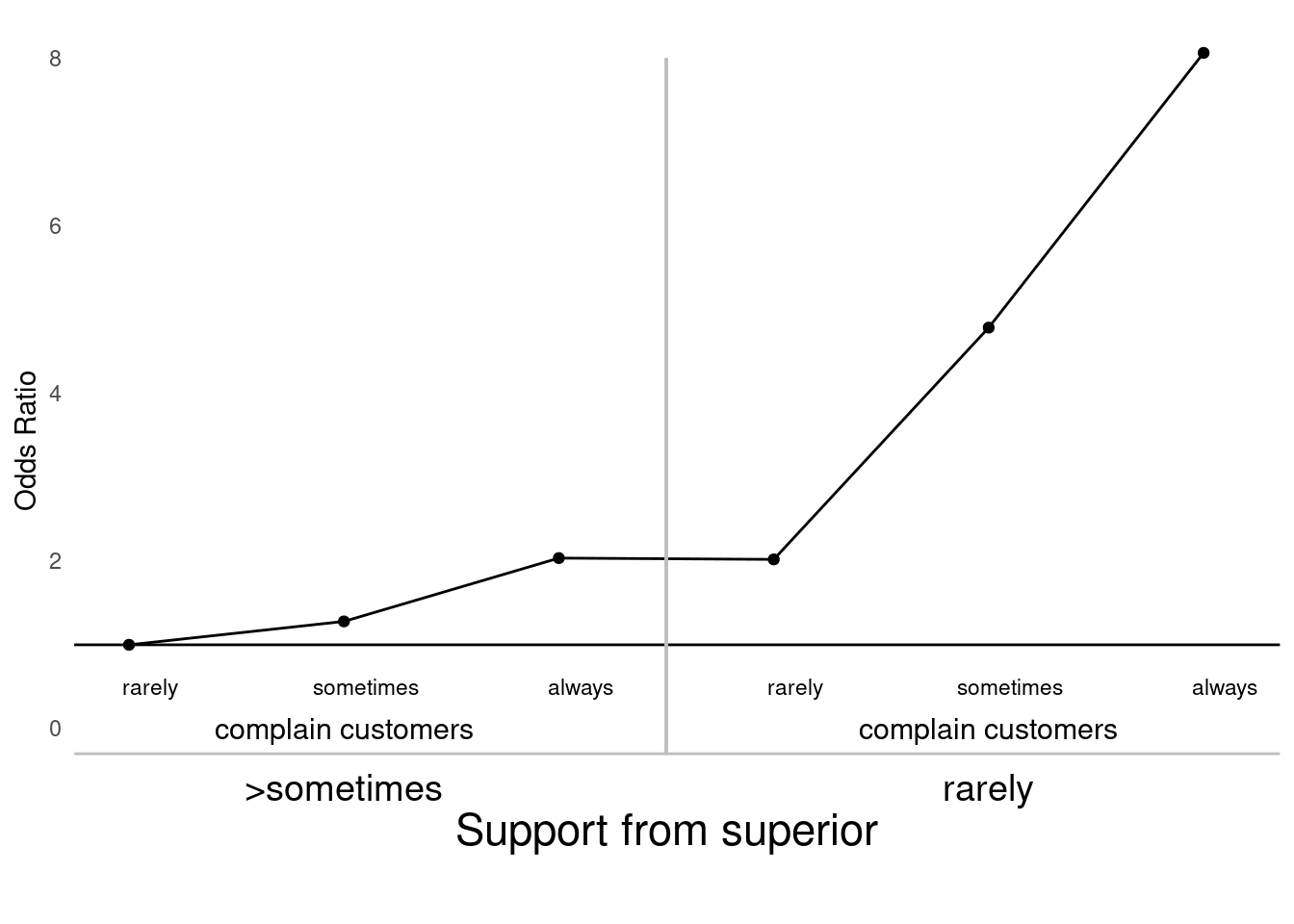 화난 고객을 상대하는 비율이 높고, 상사의 지지가 낮은 경우가 동시에 발생할 때의 오즈비를 구해보았다. 아래의 코드에서 OR 값 (백터) 또는 ORmatrix 값 (matrix) 를 이용해서 자유롭게 그림을 그려보세요. 몇가지 예시 그림을 아래에 그려 놓겠습니다.
