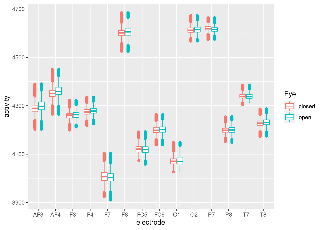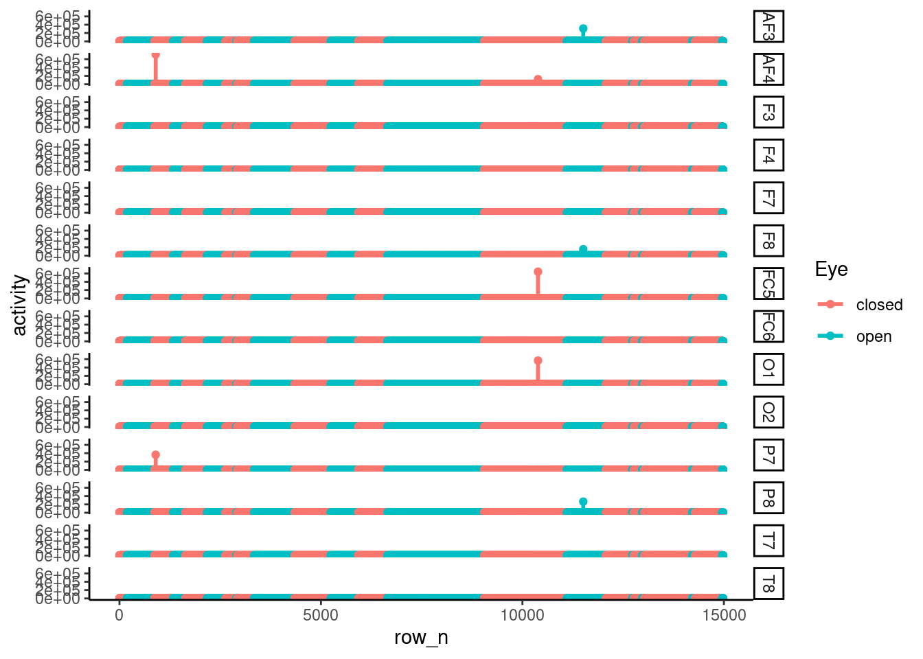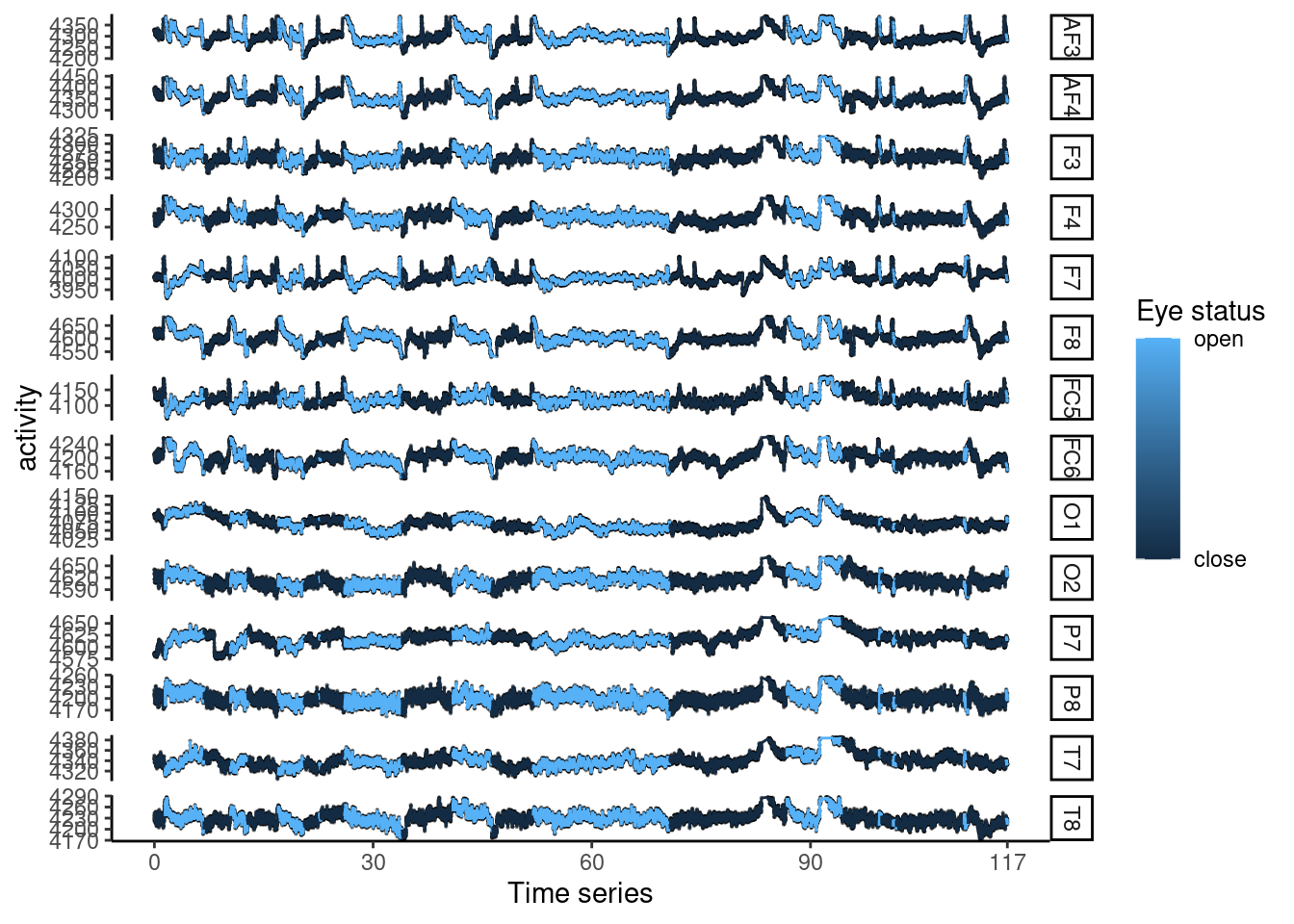 mutate(sec = seq(0, 117, length.out = nrow(.)))For data step, the long form data were created via gather function. the key represent each electrode, and the activity were stored into activity variable. EyeDetection, row_n, sec, Eye will be indentical variable for each electrode activity.