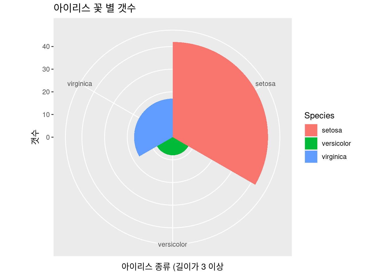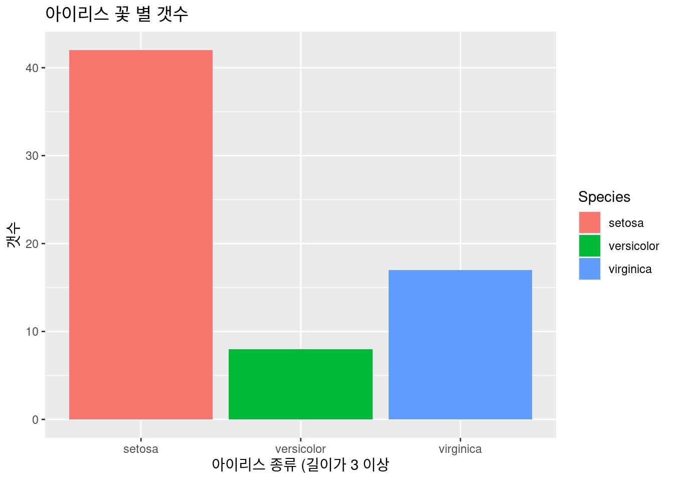 아이리스 꽃 별 갯수를 그려보겠습니다.Sepal.Width 가 3 이상인 것의 갯수를 그려보겠습니다. filter(Sepal.Width > 3)을 이용하겠습니다. 만약 길이가 길다면 아이리스 중에 어떤 종류일까요?